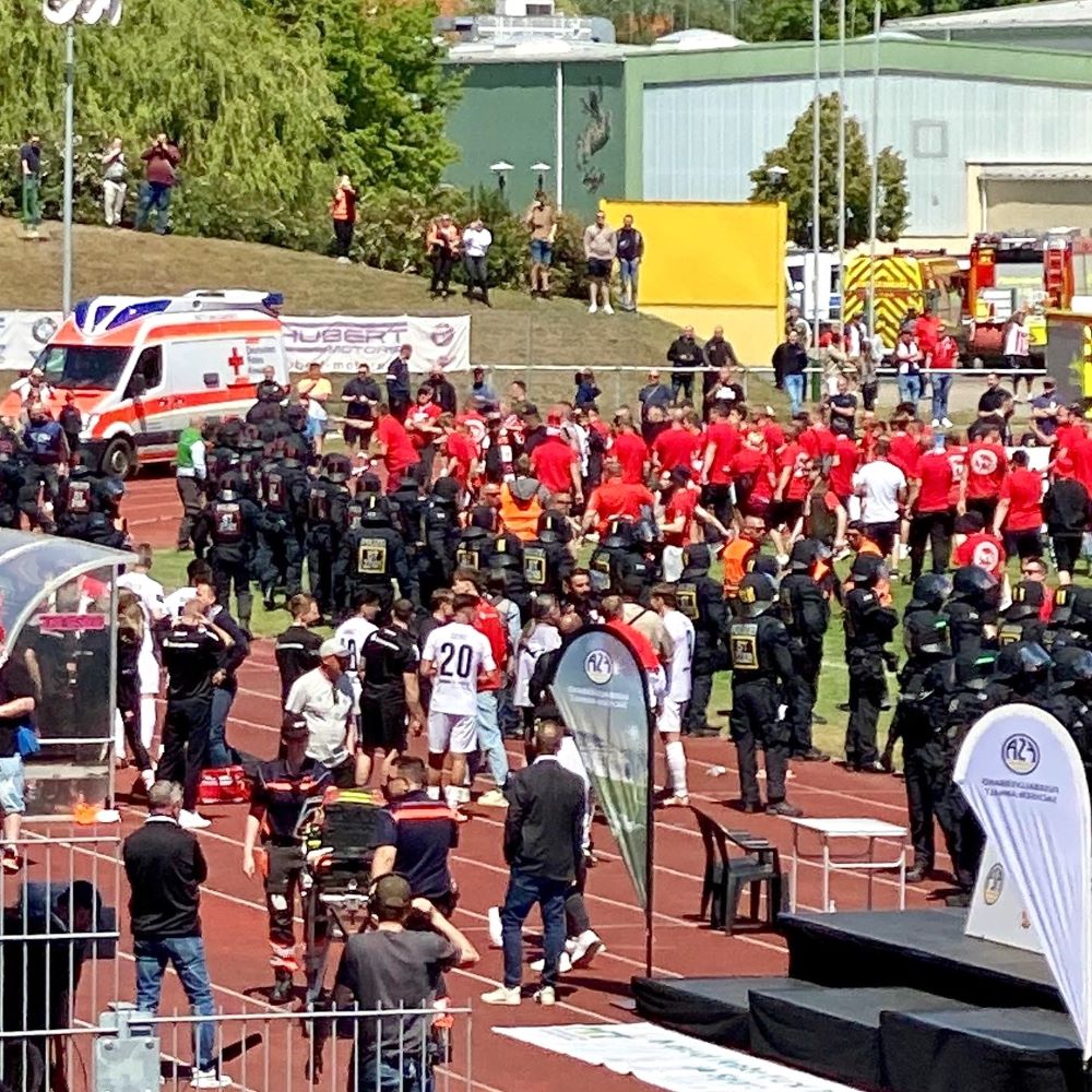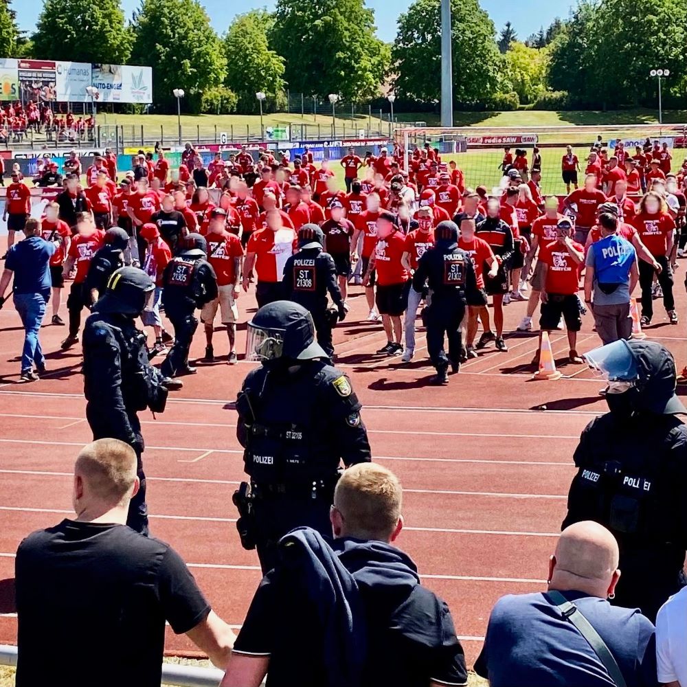 Als es wenig später zur Siegerehrung vor der Haupttribüne kam, gingen weitere Scharmützel auf der Tartanbahn hinter dem Tor los, da die Polizei einfach nicht in der Lage war die rivalisierender Fanlager vernünftig zu trennen. Wahrscheinlich waren alle kognitiv halbwegs brauchbaren Gruppen- und Zugführer heute in Leipzig im Einsatz und so wusste die Truppe in Halberstadt sich nur mit Reizstoffsprüherei aus der Nahdistanz zu helfen, um Durchbrüche durch ihre löchrigen Kordons zu verhindern.
