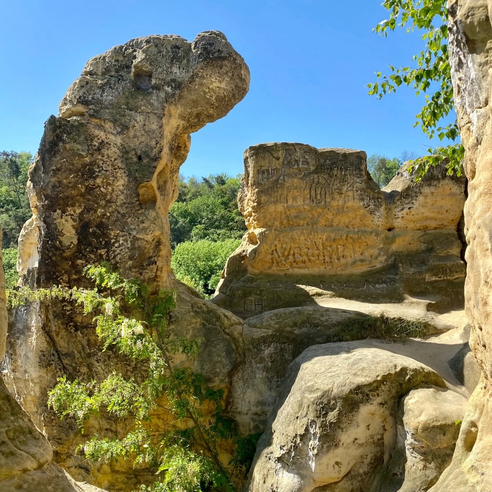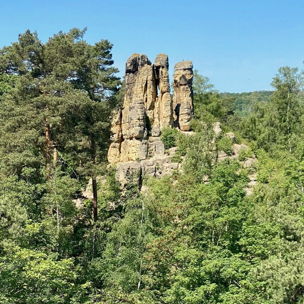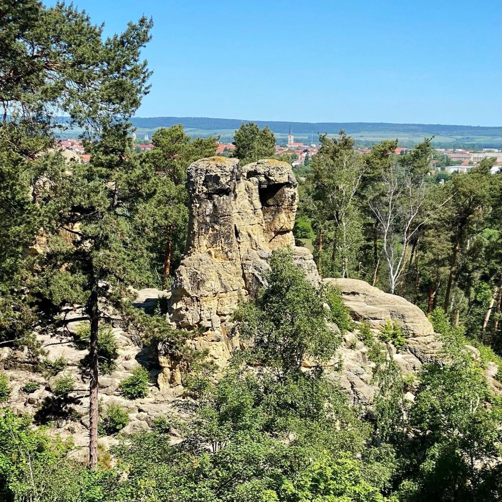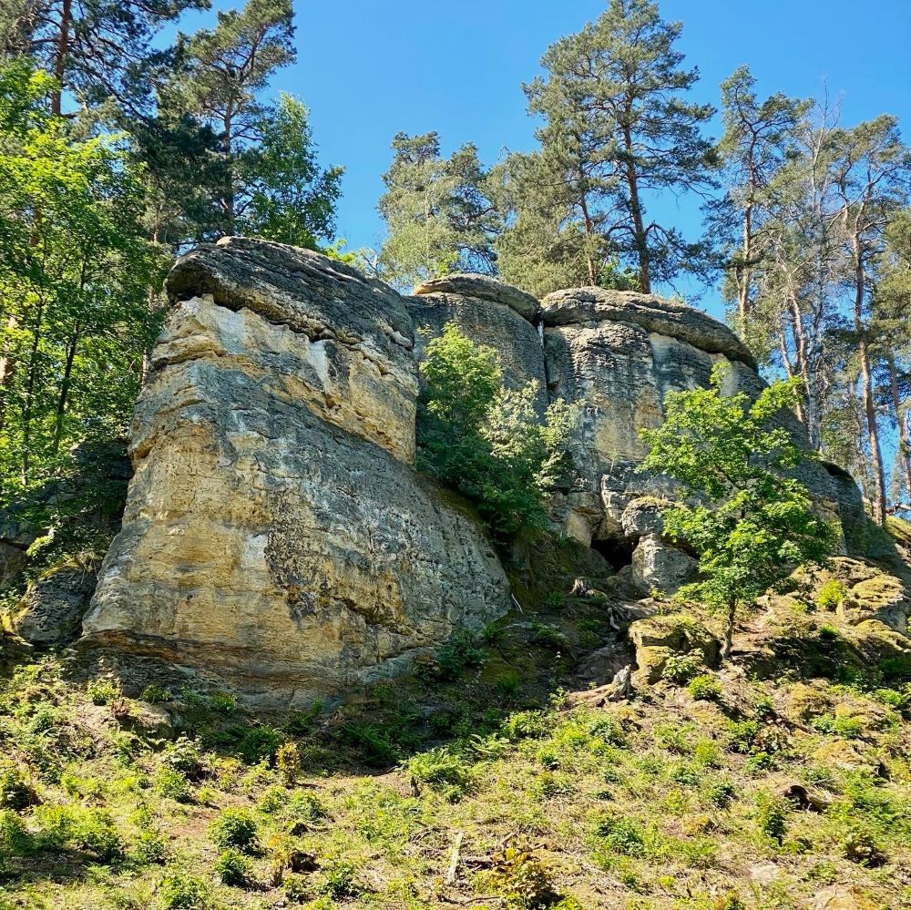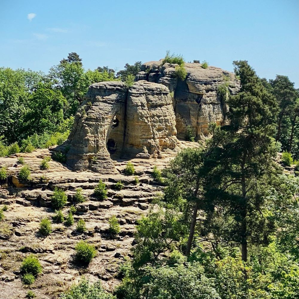 Wie jemand aus der Generation Z wie zügig startete ich nun am Fuße der Klusberge meine kleine Runde. Via Nordhangweg erklomm ich zunächst die so genannte Teufelskanzel. Von dort hatte ich schon mal einen tollen Ausblick auf den Klusfelsen und den Fünfingerfelsen. Zwei bizarre Sandsteinfelsformationen, die in vorchristlicher Zeit wahrscheinlich als heidnische Kultstätten dienten. Beide Felsen sollte ich mir auf meiner Route alsbald aus der Nähe anschauen und auch ein bisschen auf ihnen herumklettern. Am Klusfelsen beeindruckten dann besonders die von Menschenhand in den Sandstein gearbeiteten Hohlräume, die früher angeblich Schäfern Schutz vor Unwettern boten (früher waren die Klusberge unbewaldet) und im Mittelalter außerdem von Mönchen als Einsiedelei bewohnt waren.