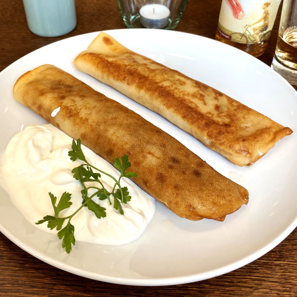 Ich entschied mich zunächst für Blintsches (Buchweizenpfannkuchen) mit deftiger Pilzfüllung und saurer Sahne (9,90 €) und eine Rhabarberschorle (3,90 €). Weil der heutige Kalorienverbrauch hoch und der Hunger entsprechend groß war, warf ich anschließend noch einen Blick in die Kuchenvitrine und ließ mir weiters ein Stück Schokokuchen (3,80 €) servieren.