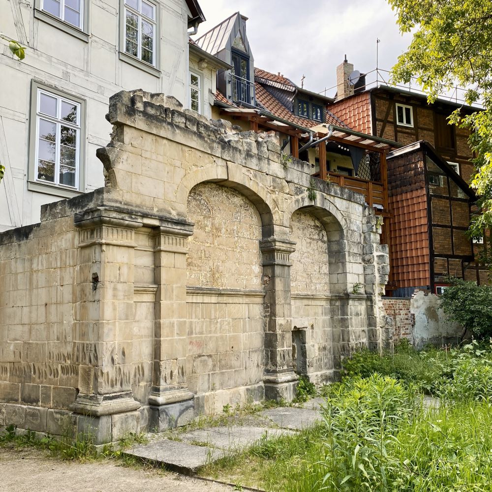 Außerdem sollte sich kein kunstsinniger Tourist den Halberstädter Domschatz entgehen lassen. Dieser gilt als einer der wertvollsten und reichhaltigsten in ganz Europa. Da das Museum nur bis 17 Uhr geöffnet hatte, sparte ich mir den allerdings für einen weiteren Besuch der Stadt auf. Stattdessen musste am Nachmittag endlich mal etwas Nahrung in den Körper und dazu suchte ich das ebenfalls nur bis 17 Uhr geöffnete Restaurant & Café Hirsch auf. Angrenzend an die letzten Ruinenreste der 1938 von den Nazis während der Reichspogromnacht zerstörten Synagoge, werden den Gästen dort süße wie auch herzhafte jüdische Spezialitäten geboten.