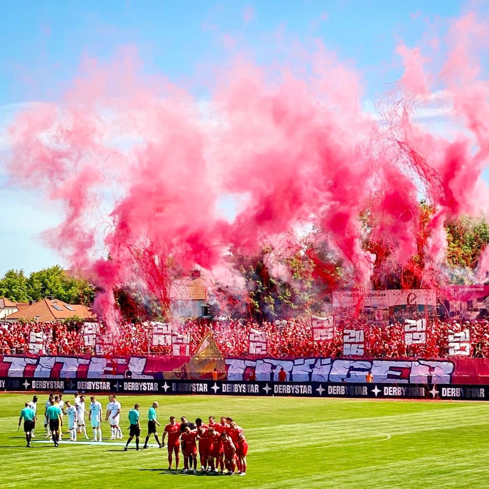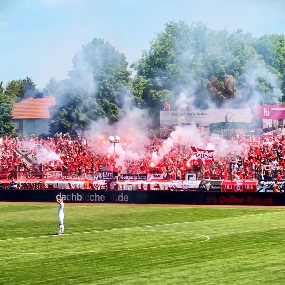 Gleichwohl ließ der HFC hin und wieder doch seine Klasse aufblitzen und in der 36.Minute hielt nur eine starke Fußabwehr vom routinierten Tormann André „Bärchen“ Helmstedt die Brockenkinder im Spiel. Mit zunehmender Spieldauer hatte ich außerdem das Gefühl, dass bei den echten Amateuren so langsam die Kräfte schwanden. Insbesondere bei den Abschlüssen fehlte es nun an Kraft und Präzision. Die Profis aus der 3.Liga verpassten allerdings den Sack frühzeitig zuzumachen und ließen das Publikum lediglich mit einem Pfostenschuss in der 68.Minute aufhorchen. Da bot ihre Anhängerschaft definitiv den sehenswerteren Auftritt, bei dem ab Mitte der 2.Halbzeit auch immer mal wieder ein paar Fackeln entzündet wurden.