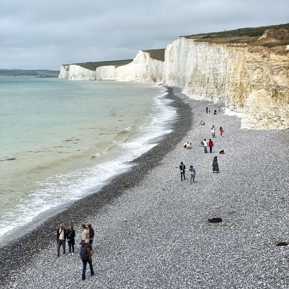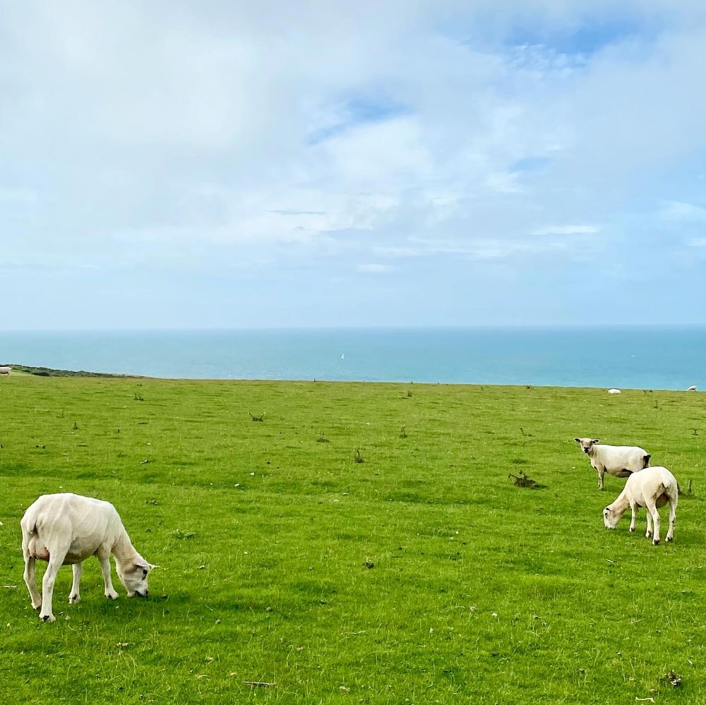 Ich hatte uns eine kleine Küstenwanderung gebastelt, die uns über das satte Grün der hiesigen Schafsweiden zu den Seven Sisters führen sollte. Jene sieben Schwestern sind eine Kette von besonders eindrucksvollen Kreidefelsen an der Küste von Sussex. Hier fällt die Hügelkette der South Downs sanft zum Meer ab, um an der Abbruchkante der Seven Sisters abrupt zu enden. Dort geht es dann über 100 Meter senkrecht hinunter zum Wasser bzw. Strand.