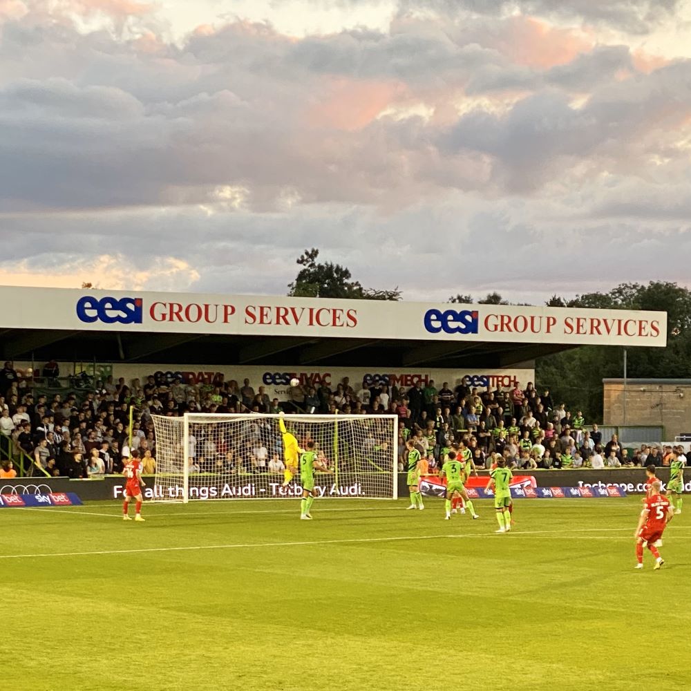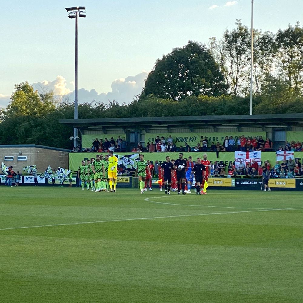 Das Spiel war obendrein auch ganz ansehnlich. Die Hausherren hatten die ersten Chancen des Abends und nach einer Viertelstunde ging FGR durch Matty Stevens in Führung. Zwar hätte Swindons George McEachran eine Minute später beinahe für den einstigen Erstligisten ausgeglichen (Swindon Town durfte 1993/94 einmalig in der Premier League reüssieren), doch sein Fernschuss streifte nur die Torlatte. Danach hatten die Veganer die Partie relativ gut im Griff, versäumten jedoch bis zur Pause ein zweites Tor gegen die Robins (Rotkehlchen) nachzulegen. Nichtsdestotrotz war ihr Anhang im ersten Durchgang nach der Führung gut drauf und zumindest die Singing Area hinter dem Tor intonierte immer wieder Fangesänge.