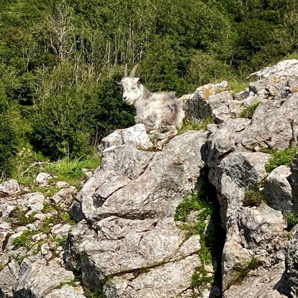 Nach weiteren knapp 1,5 km Kammweg stiegen wir wieder steil in die Cheddar Gorge hinab, um nach der Überquerung der Straße noch steiler auf der anderen Seite der Schlucht die dortigen Karstfelsen hinaufzusteigen. Bei hochsommerlichen Temperaturen ziemlich schweißtreibend, aber oben wartete wieder eine Belohnung. Auf und an den Klippen fühlt sich eine Herde Ziegen wohl und genießt dort ihren mehr oder weniger natürlichen Lebensraum. Da Ziegen zu den Lieblingstieren meines Bruders gehörten und er u. a. die Patenschaft für eine Ziege im Hildesheimer Wildgatter übernommen hatte, freute uns diese tierische Überraschung besonders.