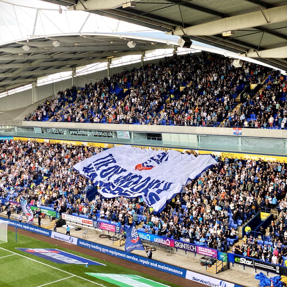 Der Schwung wurde gleich mit ins Treppenhaus genommen, so dass wir 12:27 Uhr auf unseren Plätzen à £ 34 im Oberrang der Gegengerade saßen. Tatsächlich war ein Großteil der 28.723 Zuschauerplätze in diesem All-Seater verkauft worden. So wie sich das für ein Derby gehört. Erst recht wenn der Gastgeber Bolton Wanderers als Tabellenführer mit drei Siegen in drei Spielen in den 4. Spieltag geht und Absteiger Wigan Athletic mit zwei Siegen und einem Remis ebenfalls noch ungeschlagen ist. Der BWFC wiederum war 2022/23 knapp im Aufstiegsrennen gescheitert und beide Rivalen dürften zu Saisonbeginn das Ziel Aufstieg in die zweitklassige Championship postuliert haben (mindestens intern). Obendrein ist das Stadion der Wanderers nur 9 km von Wigans Stadtmitte entfernt. Kein Wunder also, dass der Anhang von Wigan Athletic das Away End gut gefüllt hatte. Es dürften rund 4.000 Supporter der Latics im Stadion gewesen sein.