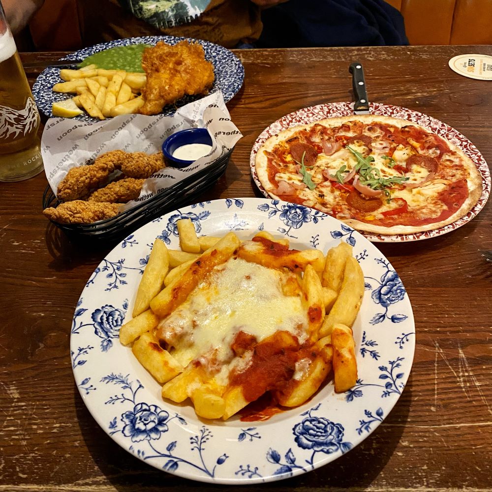 Nein, diesmal nicht bei Wetherspoon’s. Stattdessen führte uns der Internetsuchbegriff Sunday Roast in den Pub The Three Tuns. Leider waren die Sonntagsbraten bereits alle über den Tresen gegangen und noch schlimmer; wir mussten jetzt umgehend etwas Essbares ordern, da in einer Minute Küchenschluss sei. Der Vater zeigte umgehend auf die prominent per Foto in der Speisekarte angepriesenen Chicken Wings. Aber was nehme ich? Einen Burger? Ein Steak? Verdammt, es können nur noch wenige Sekunden sein, bis das Kassensystem automatisch die Speisekarte sperrt… Also das Gericht direkt unter Chicken Wings gewählt. Chicken Katsu, was auch immer das ist. Es entpuppte sich als panierte Hähnchenbruststreifen in pikanter Currysauce mit der etwas komischen Beilagenkombination Reis und Pommes frites.