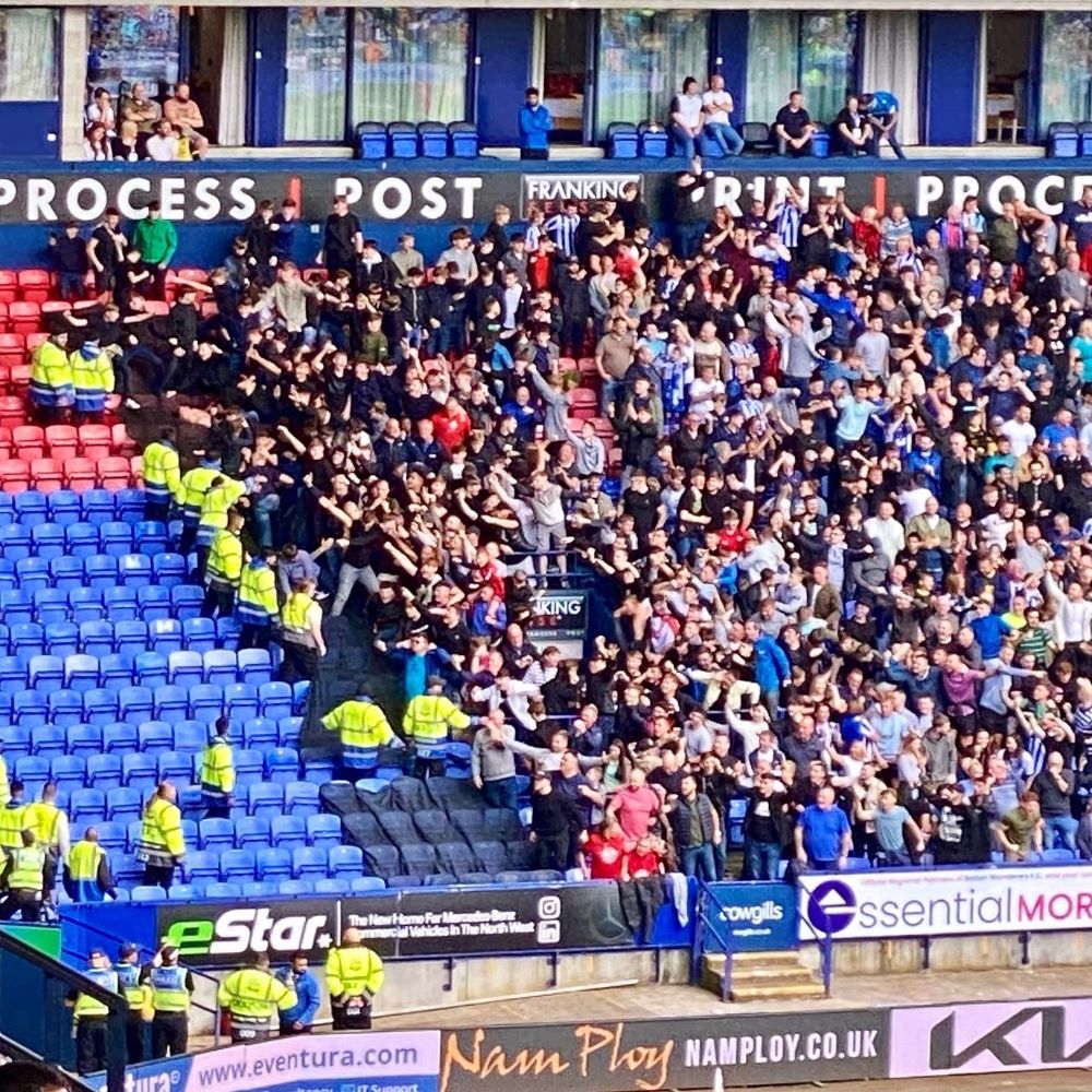 Zunächst wurden deren Gesänge noch vom Heimanhang übertönt. Die Euphorie bei den Fans des 1874 gegründeten Bolton Wanderers FC, der nebenbei 1888 zu den zwölf Gründungsvätern der English Football League gehörte und auf stolze 72 Spielzeiten Erstklassigkeit zurückblicken kann, bekam jedoch schnell einen Dämpfer. In der 12. Minute fühlte sich bei einem Eckstoß niemand für Wigans Charlie Wyke zuständig und der einem breiteren Publikum durch die Dokumentation Sunderland Til I Die bekannte Angreifer konnte aus kurzer Distanz zum 0:1 einschieben. Die Fans des erst 1932 gegründeten Gastvereins flippten erstmals an diesem Mittag aus und anschließend wurde ihr Gegenüber landestypisch verhöhnt und provoziert.