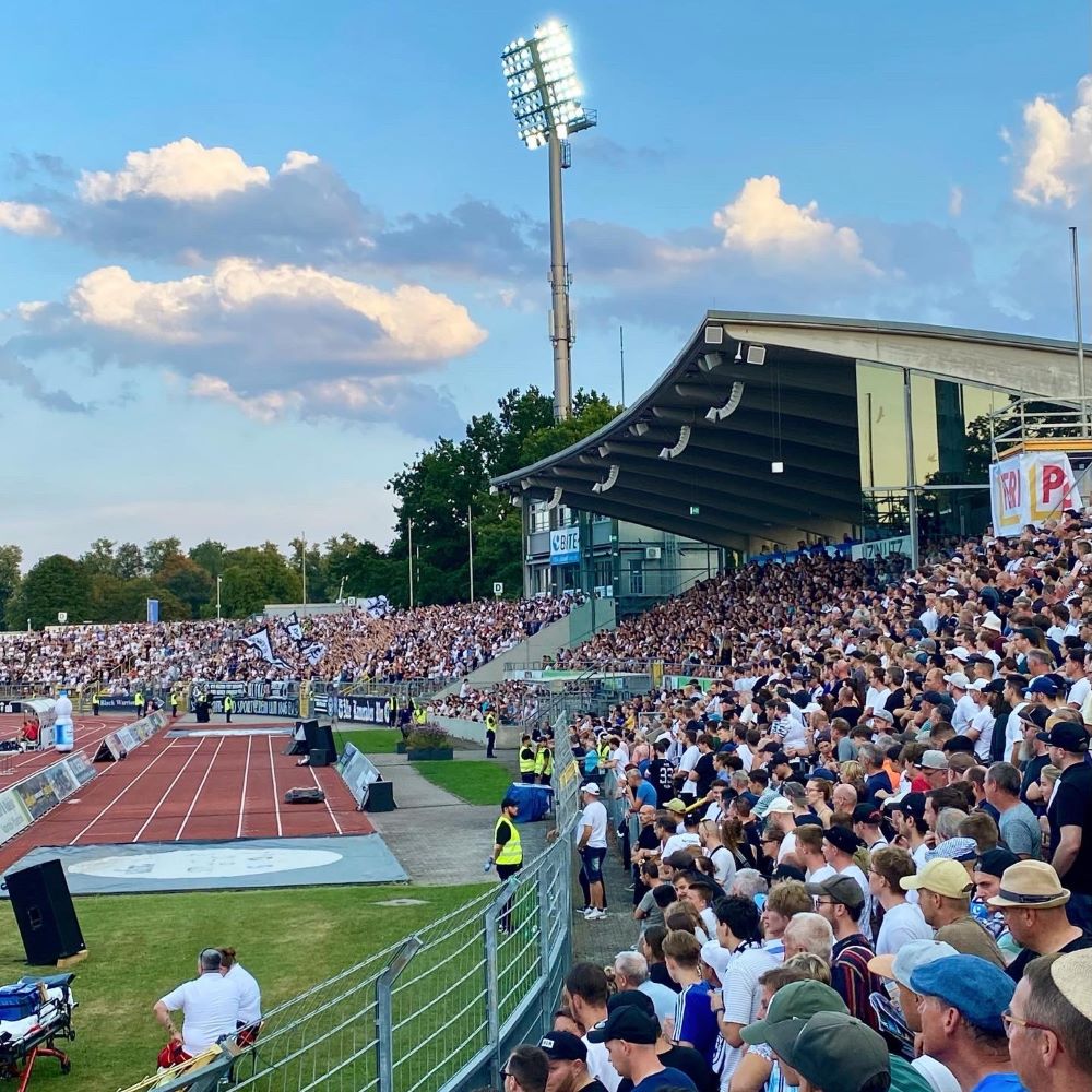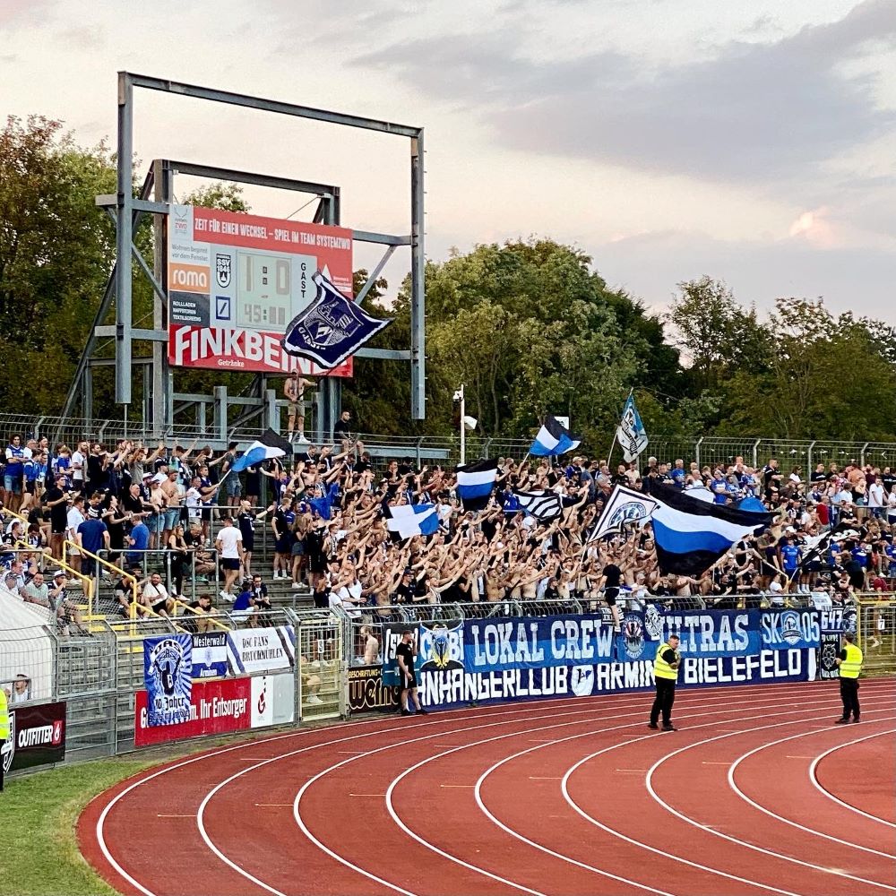 Beim Absteiger Arminia Bielefeld herrschte heute Abend ebenfalls etwas Euphorie. Hatte die Mannschaft den Fans doch am vorigen Wochenende einen klaren Derbysieg gegen Preußen Münster geschenkt (4:0). Nach mindestens 18,96 Monaten voller Enttäuschungen und Demütigungen – die Wunden aus den Relegationsduellen mit Wehen-Wiesbaden sind noch frisch – war die Fußballwelt in Bielefeld endlich mal wieder auf den Kopf gestellt. Man erhoffte sich, dass der Derbysieg für die Mannschaft gewissermaßen ein Brustlöser war und grüßte die Erfolgself zu Spielbeginn mit dem Dankesbanner „Derbysieger – Danke Jungs! Zusammen weiter nach vorn!“.