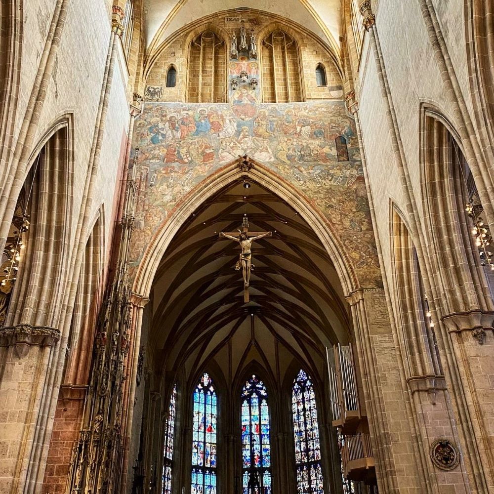 Bei der Innenausstattung wurde ebenfalls nicht jeder Gulden zweimal umgedreht. Ich durfte mich u. a. an einem wirklich meisterhaften Chorgestühl von Jörg Syrlin d. Ä. und Glasfenstern aus der Werkstatt von Jakob Acker erfreuen. Auch der im Wesentlichen von Martin Schaffner gestaltete Hochaltar und der Schmerzensmann des Bildhauers Hans Multscher wissen Kunstfreunde zu begeistern. Insgesamt konnte sich eine Vielzahl von Malern und Bildhauern bei der Innengestaltung des Münsters auszeichnen und damit oft für Folgeaufträge empfehlen. Als Ulmer Schule bezeichnet man daher kunsthistorisch ein Netzwerk von in Ulm beheimateten oder wirkenden Künstlern und Werkstätten, die sich in der Spätgotik einen exzellenten überregionalen Ruf erworben hatten.