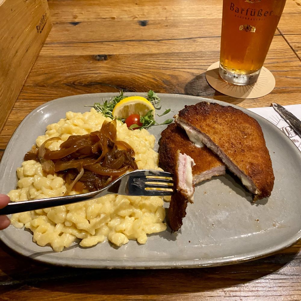 Nach Abpfiff spazierte ich bei immer noch 26° C zurück in die Altstadt und machte mich auf die Suche nach einem Restaurant, dessen Küchenpersonal um 21:30 Uhr immer noch gezwungen war am Herd zu stehen. Das historische Brauhaus Drei Kannen wies mich ab, weil bereits Küchenschluss war und viele Lokale waren bereits komplett verrammelt. Im Schatten des Münsters fand ich dann aber die Barfüßer Hausbrauerei, bei der noch ordentlich Betrieb herrschte. Ebenso glühten die hiesigen Herdplatten weiterhin und alsbald bekam ich ein pfannenfrisches Cordon Bleu mit Käsespätzle und Schmelzzwiebeln als Begleitung serviert (19,90 €). Zugleich sorgte ein rotgoldenes Kellerpils (0,5 l für 4,70 €) für wohltuende Benetzung der Kehle in dieser schwülen Sommernacht.