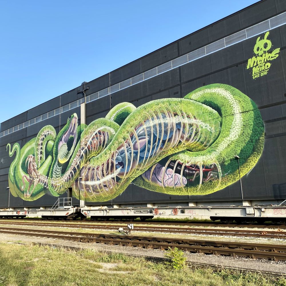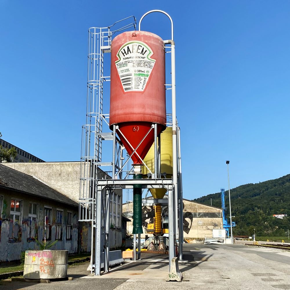 Nach dem späten Mittagessen gönnte ich mir mal wieder ein Duschbad im Hotel und anschließend zog es mich zum von den Nazis ab 1938 angelegten Industriehafen an der Donau. Allerdings nicht, um die dunkelsten Kapitel der Stadtgeschichte nochmal zu vertiefen, sondern um Linz von seiner buntesten Seite kennenzulernen. Um 16 Uhr nahm mich dort Flip in Empfang. Jenes Urgestein der hiesigen Hip-Hop-Szene ist nicht nur seit mittlerweile 30 Jahren Produzent und MC bei der Formation Texta, sondern er engagiert auch sehr beim 2011 ins Leben gerufenen Kunstprojekt Mural Harbor Gallery. Damals gab die LINZ AG als Hafenbetreiber grünes Licht die Hallen, Silos und sonstigen Hafenanlagen mit Muralismo, Graffiti und Streetart zu adeln. Mittlerweile sind es rund 300 Bilder von Künstlern aus über 30 Ländern, die Linz einen festen Platz auf der Weltkarte der Sprühkunst verschafft haben.