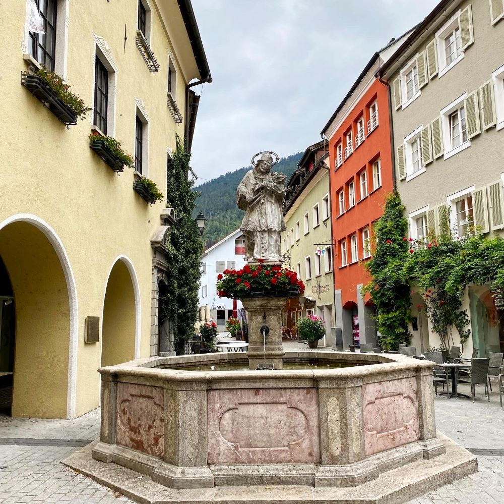Um 9:30 Uhr machte ich mich an die Tagesplanung. Zehn Stunden hatte ich noch bis zum Anpfiff vom derzeit größtem Derby im Ländle. Leider hatte sich der Himmel über Dornbirn erneut zugezogen wie Technofreunde auf einer Busreise zur Nature One. Da reizte eine angedachte Fahrt mit der Bergbahn auf den nahen Hausberg Karren (971 m ü. NN) mit anschließender Wanderung durch die Rappenlochschlucht nicht mehr wirklich. Ich beschloss stattdessen eine Tageskarte für den Verkehrsverbund zu erstehen (16 €) und damit zunächst von Dornbirn nach Feldkirch zu fahren. Kaum aus dem Hotel, durfte ich schon den abermals geborgten Regenschirm aufspannen. Aber mit dem Ticket konnte ich wenigstens gleich einen Bus zum Dornbirner Bahnhof nehmen und von dort transportierte mich die nächstbeste S-Bahn um 10:30 Uhr binnen 30 Minuten nach Feldkirch. In der mit rund 35.000 Einwohnern zweitgrößten Stadt des Bundeslandes schien tatsächlich (noch) die Sonne und ich machte mich sogleich an die Erkundung der historischen Altstadt. Vielfach als der schönste historische Stadtkern Vorarlbergs gerühmt.