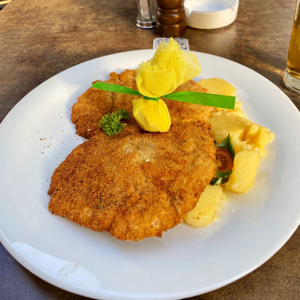 Die klassizistische Stadtpfarrkirche St. Martin, welche 1840 die mittelalterliche Dorfkirche an diesem Platz beerbte, und das Ensemble aus Feuersteinhaus (1611) und Johann-Luger-Haus (1902) sind weitere hübsche Bauwerke am Marktplatz. Das Areal war am frühen Freitagabend derweil sehr belebt und die Gastwirte brauchten sich nicht über mangelnde Auslastung beklagen. Meinen abendlichen Appetit durfte hier gegen 18:30 Uhr das im Roten Haus untergebrachte gleichnamige Restaurant stillen. Ich ließ mir Schweineschnitzel Wiener Art mit hausgemachtem Kartoffelsalat (19,90 €) und einen halben Liter Pils der hiesigen Mohrenbrauerei (4,50 €) servieren. Wusste erfreulicherweise alles geschmacklich zu überzeugen.