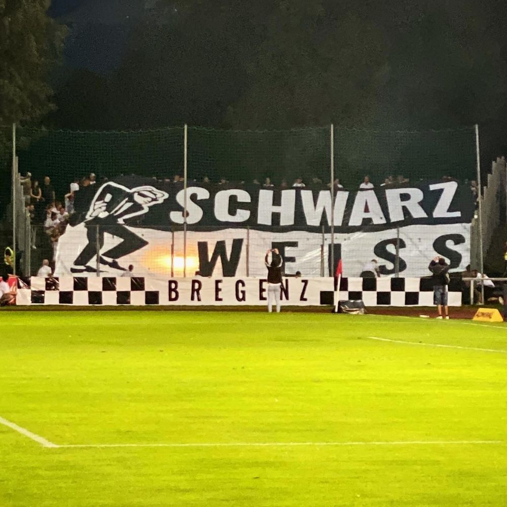 Dornbirn ist bereits seit 2019 (wieder) zweitklassig und durfte sich heute über 3.500 Besucher beim ersten Derby der Saison freuen. Wovon auch außerhalb des Gästeblocks viele zum Gastverein hielten. Dornbirn dagegen hat keine aktive Fanszene (mehr). Die 1994 gegründeten White Devils scheint es nicht mehr zu geben oder sie haben zumindest ihre Aktivität eingestellt. Daher fehlte es der von Ultras Bregenz (2000) und Bianco e Nero Supporters Bregenz (2005) geprägten Szene aus der Landeshauptstadt leider an einem Gegner auf den Rängen. Nichtsdestotrotz hatte man auf Bregenzer Seite ordentlich mobilisiert, schicke weiße Mottoshirts produziert und das vom Ska inspirierte Motiv jener Shirts (mit Nutty Dancer und Schachbrettmuster) auch auf eine den Gästeblock überspannende Folie gezaubert. Als das Machwerk zum Spielbeginn präsentiert wurde, leuchtete unter der Blockfahne außerdem noch etwas Pyrotechnik auf.