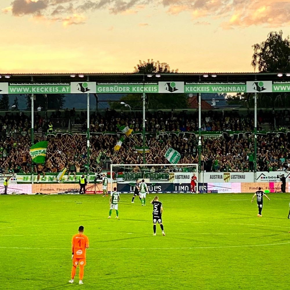 In der Gästekurve fiel das Tête-à-Tête von Anhang und Mannschaft natürlich etwas aus. Hier wurde der erste Derbysieg gegen Lustenau nach 9,6 Jahren Durststrecke – zugleich der erste Sieg gegen den Rivalen auf Bundesligaebene – natürlich lustvoll ausgekostet. Für den bereits von 2006 bis 2009 erstklassigen SCRA läuft’s in der zehnten Bundesligaspielzeit seit dem Wiederaufstieg (2014) bisher ganz gut. Man klettert zumindest vorläufig auf den 4.Rang. Die Lustenauer, die erst seit 2022 wieder Teil der Bundesliga sind (davor 1997 -2000), sollten den ersten Saisonsieg dagegen nicht mehr zu lange aufschieben. Weil steckt man erstmal unten drin…