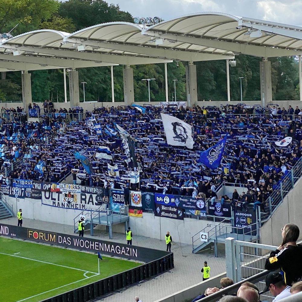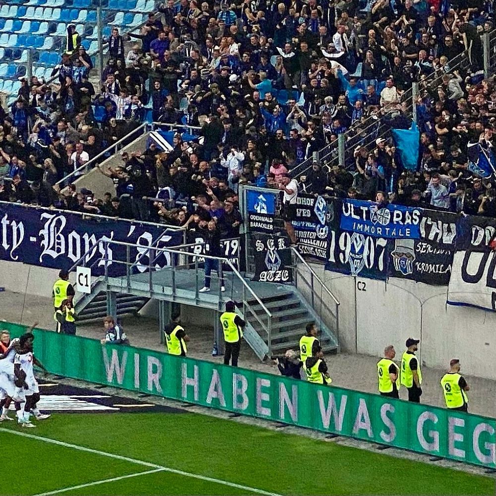 Mit wenigstens ein bisschen was im Magen, konnte ich der 2.Halbzeit wieder konzentriert folgen. Das saarländische Gründungsmitglied der Bundesliga gab zunächst weiter den Ton an. Jedoch wirkte der Waldhof etwas sortierter als im ersten Durchgang und Saarbrücken kam zu deutlich weniger Abschlüssen als vor dem Seitenwechsel. In der 74.Minute stellte gar ein Stürmer mit dem klangvollen Namen Charles-Jesaja Herrmann den bisherigen Spielverlauf auf den Kopf. Plötzlich stand es 0:1 und nach kurzer Torfreude motivierte der Führungstreffer den Gästeblock zur Intensivierung der Provokationen. Gefühlt drehte sich die Hälfte der Mannheimer Gesänge eh um das Gegenüber, aber besonders bei „Volk ohne Heimat! Ihr seid ein Volk ohne Heimat!“ musste ich doch ein wenig schmunzeln. Erst recht, weil mein Sitznachbar lautstark mit „Volk ohne Arbeit! Ihr seid ein Volk ohne Arbeit!“ konterte.