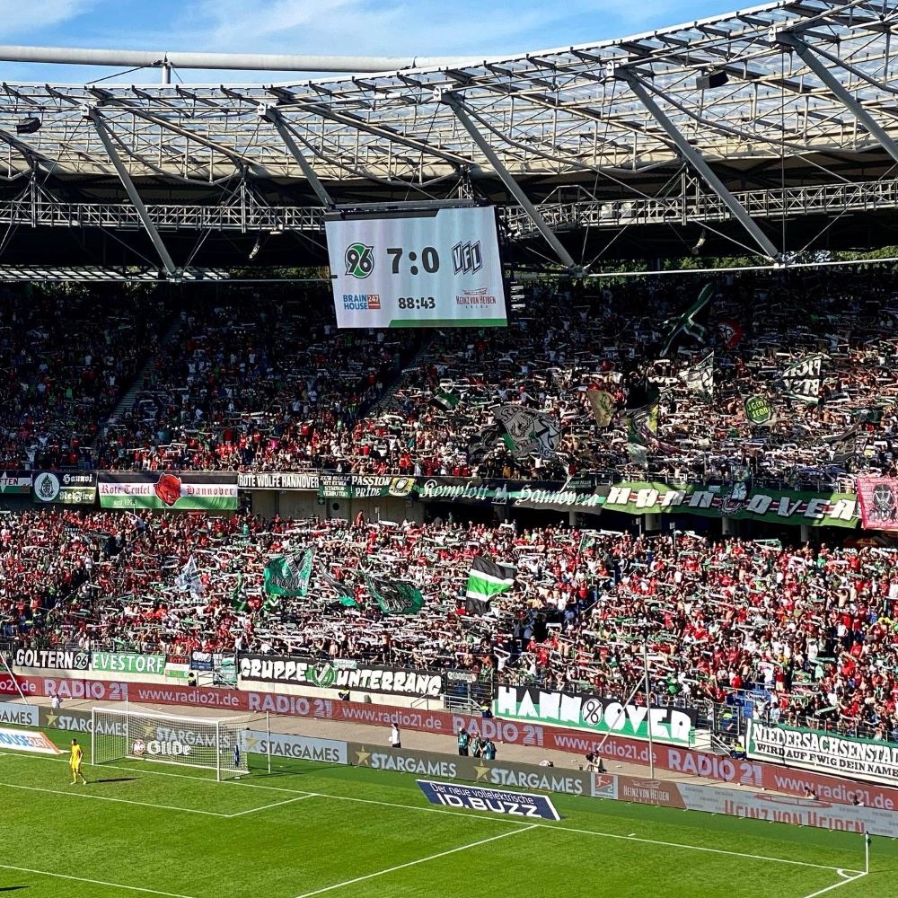 Reich fühlte ich mich an jenem Tag dank meiner Freunde und der schönen gemeinsamen Zeit dennoch. Daher war ich bereit Ao Tanaka vorerst zu verzeihen. Er war allerdings gut beraten heute gegen 96 kein entscheidendes Tor zu schießen. Ansonsten würde ich ihn wohl doch noch zum Kumite herausfordern müssen und dabei bestimmt seine Karriere beenden. Zum Glück saß mein potentieller neuer Erzfeind zunächst auf der Bank und zugleich startete 96 vor rund 35.000 Zuschauern fulminant in die Partie. Bereits in der 7.Minute durfte ich von meinem 34 € teuren Sitzplatz auf der Gegengerade aufspringen, als Cedric Teuchert die Führung für die Roten Riesen erzielte.