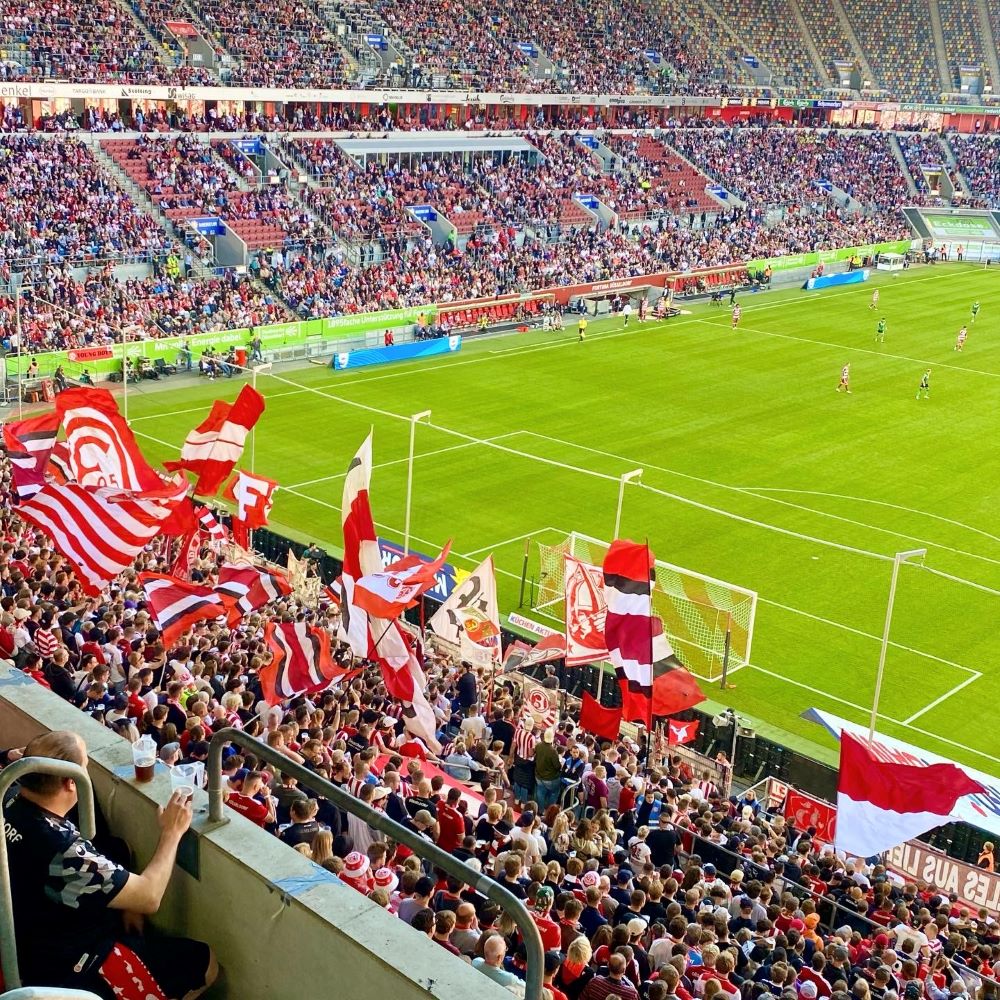 Die 1,896 km vom Hotel zum 1953 eröffneten und von 2015 bis 2021 für ca. 46,5 Mio € modernisierten Ludwigsparkstadion ging ich nun auch zu Fuß. Entsprechend war ich gut 20 Minuten vor Anpfiff am Stadioneingang und weitere 10 Minuten später auf meinem Platz auf der Gegengerade (27,50 €). Die ist wiederum beim Umbau weitgehend erhalten geblieben und überragt die drei komplett neu gebauten anderen Tribünen. 14.151 der insgesamt 16.003 Zuschauerplätze waren für das heutige Spiel verkauft worden. Es würde wohl keine der beiden Szenen zum großen Derby stilisieren, aber hassen tut man sich trotzdem. Entsprechend viele Pöbeleien und Schmähgesänge sollten mich in den kommenden zwei Stunden erwarten.