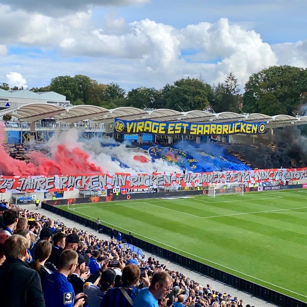 Doch zunächst einmal stand auf der Heimseite Freundschaft statt Feindschaft im Mittelpunkt. Bereits seit 1998 fühlen sich die Fanszenen des 1.FC Saarbrücken und der AS Nancy-Lorraine freundschaftlich verbunden. Eine Blockfahne auf der Virage Est zeigte nun ein Freundschaftsemblem und die beiderseits gern genutzten Kokarden in den jeweiligen Farben. Die Fans reckten rechts und links davon mit den Kürzeln 1.FSC und ASNL bedruckte Zettel in die Höhe. „25 Jahre Rücken an Rücken – Für immer & ewig – Nancy & Saarbrücken“ stand wiederum auf einem Banner vor der Virage Est geschrieben. Für etwas mehr Pep sorgten außerdem üppige Rauchsäulen in den Farben beider Vereine.