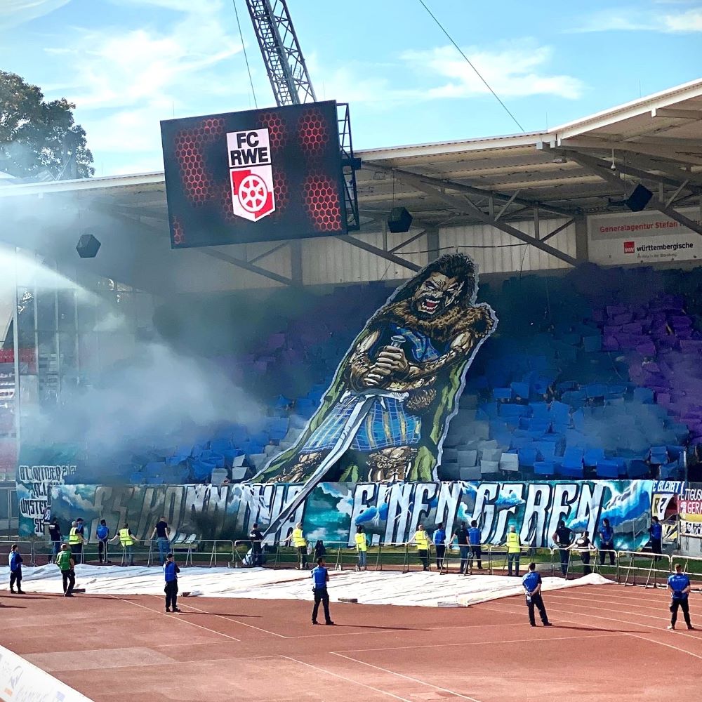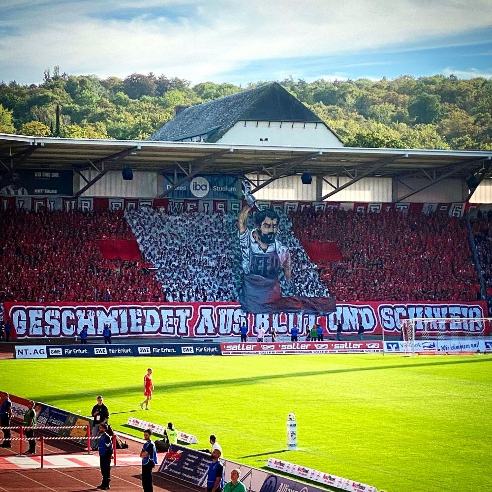 Auf der Heimseite war das Intro unterdessen nicht minder eindrucksvoll. Bereits lange vor Anpfiff hatte alle Erfurter in der Kurve Leibchen in den Vereinsfarben über die Oberbekleidung gezogen. Kurz vor Spielbeginn wurde vor dieser rot-weißen Wand das Bildnis eines Schmieds hochgezogen. Er schlug mit seinem Hammer auf einen blutigen Amboss und auf seiner Latzschürze war das Kürzel der Erfordia Ultras (EFU) zu lesen. Vor dem Block stand ferner „GESCHMIEDET AUS BLUT UND SCHWEIẞ“ geschrieben. Nachdem der Schmied wieder verschwunden war, wurde ein großes RWE-Wappen hochgezogen. Diese Insigne des 1966 gegründeten FC Rot-Weiß sollte offenbar das Ergebnis des zuvor angedeuteten Schmiedeprozesses darstellen und wurde stilisiert von zwei übergroßen Händen in die Höhe gereckt. Dieser zweite Akt der Choreographie wurde mit „DIE REPUBLIK STEHT ZU ROT-WEISS“ untertitelt und mit etlichen goldenen Sprühfontänen garniert (siehe Titelbild).