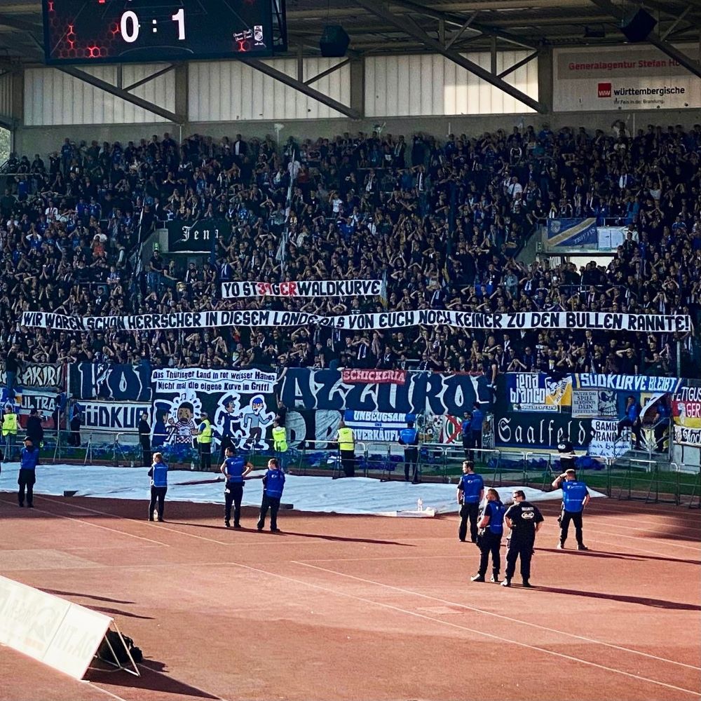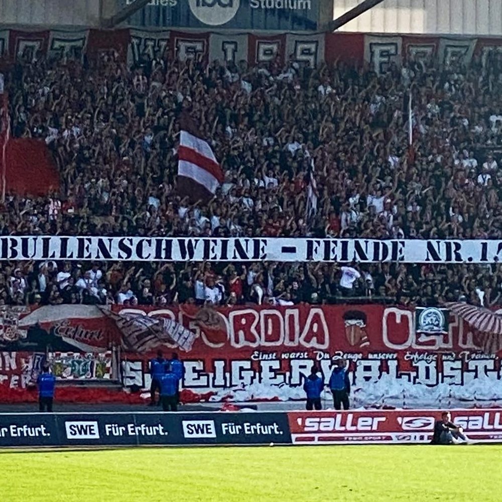 Auf den Rängen klang die 1.Halbzeit ebenfalls berichtenswert aus. Offensichtlich auf die jüngsten Wohnungsdurchsuchungen* unter der Woche gemünzt, hatten die Erfurter das Spruchband „Bullenschweine – Feinde Nr.1!“ in ihrem Sektor präsentiert. Die Gäste schmähten sogleich ebenfalls die Polizei mit Sprechchören, hatten dann aber noch Vorwürfe gegenüber der Erfurter Fanszene im Gepäck. Auf einer ausgerollten Tapete war „Yo St31gERwaldkurve: Wir waren schon Herrscher in diesem Lande, als von euch noch keiner zu den Bullen rannte!“ zu lesen, während am Zaun ein Banner darstellte, wie sich ein Erfurter bei einem Polizisten ausheult und ein weiterer Uniformierter einen maskierten Jenenser verfolgt. Dazu der Spruch: „Das Thüringer Land in rot-weisser Hand? Nicht mal die eigene Kurve im Griff!“.