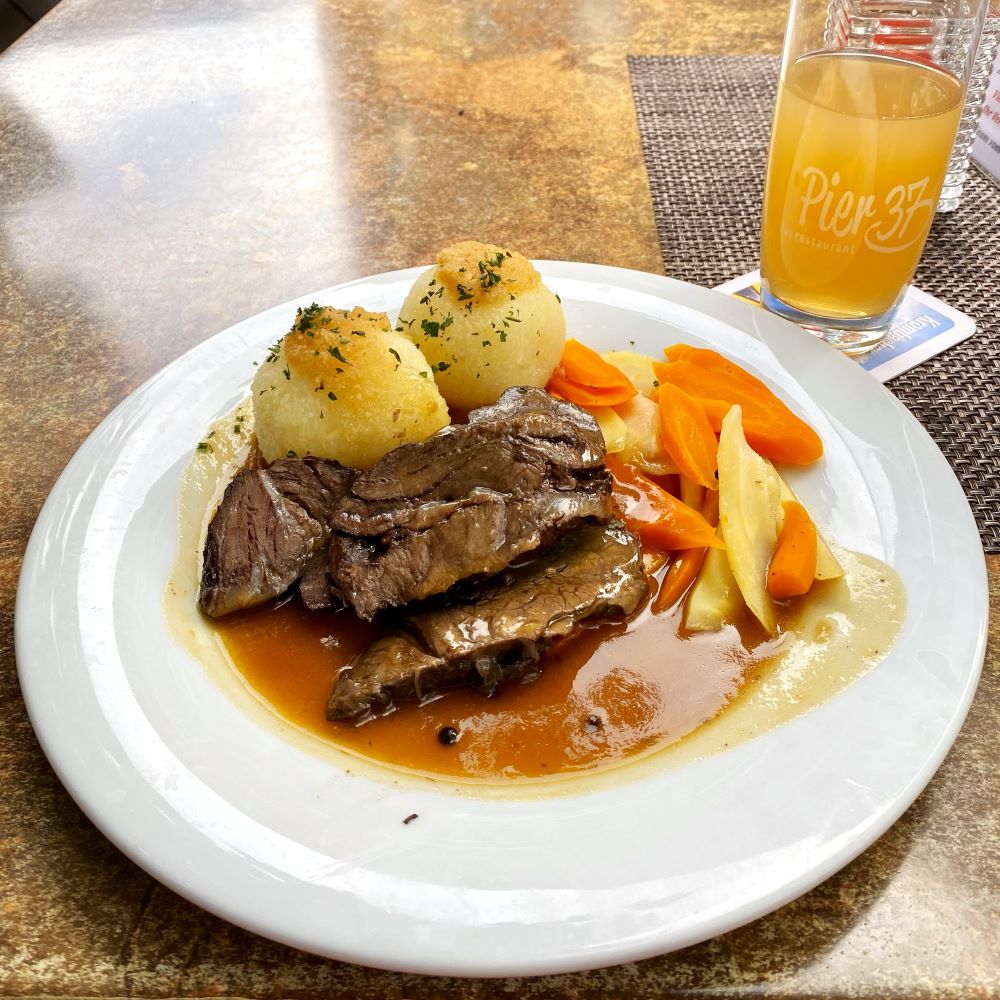 Nach rund 45 Minuten Spaziergang ließ ich mich schließlich am Ufer der Gera auf der Terrasse des Restaurants Pier 37 nieder. Erst einmal orderte ich eine große Apfelschorle (4,70 €) und dann entschied ich mich für die Ochsenbäckchen an Rotweinsauce mit glasiertem Karotten-Pastinaken-Gemüse und Thüringer Klößen (26,60 €). Sollte ich nicht bereuen, denn alles auf dem Teller entpuppte sich als hervorragend zubereiteter Genuss. Was meine flüchtigen Blicke auf den Nachbartischen erspähten, sah ebenfalls gut aus. Dieses Restaurant kommt daher für definitiv für einen Zweitbesuch in Betracht.