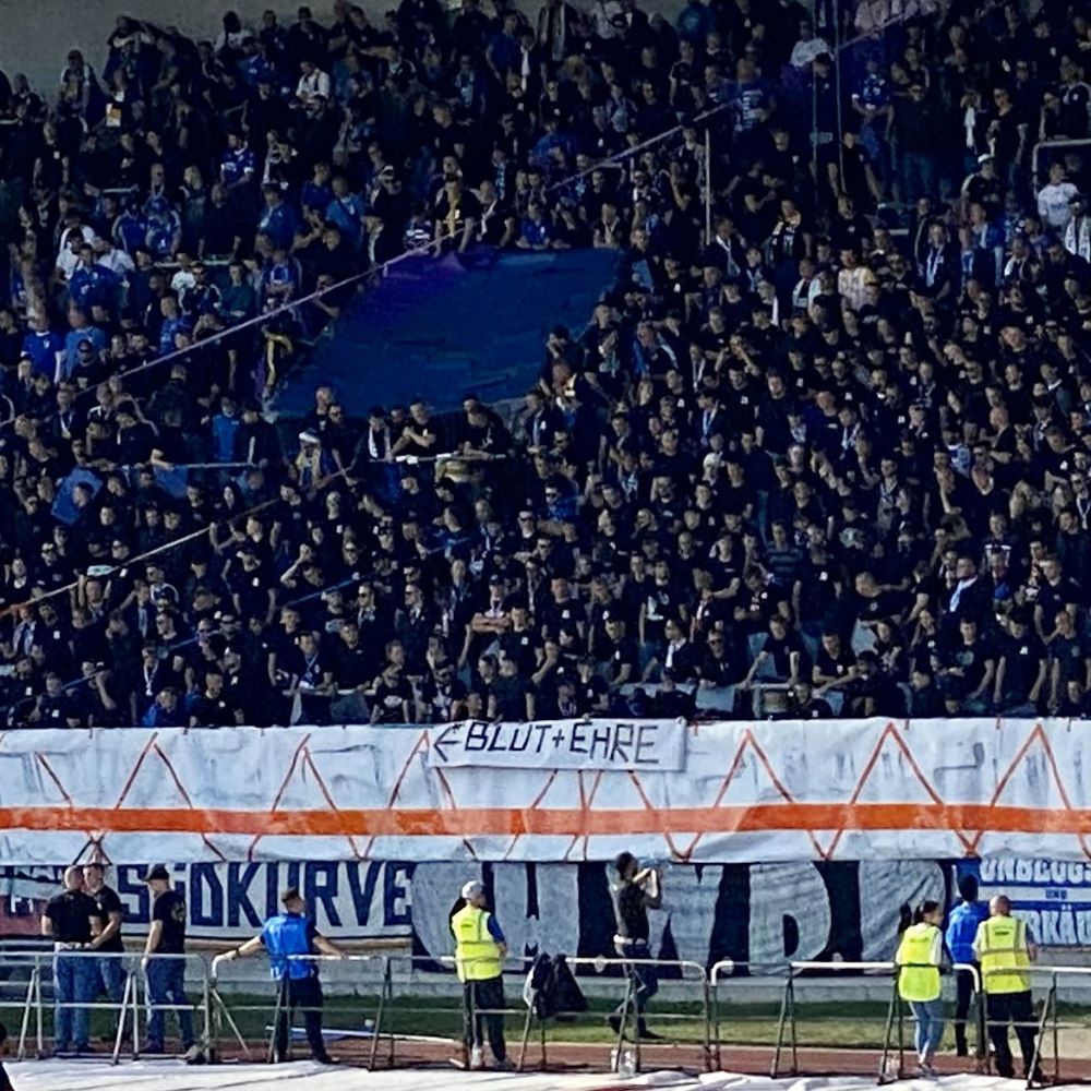 Um 15:15 Uhr brach ich dann zum Steigerwaldstadion auf und sollte die 1931 eröffnete und zwischen 2015 und 2017 umfangreich modernisierte Heimstätte des FC Rot-Weiß Erfurt knapp 25 Minuten später erreichen. Da der Großteil der heute anwesenden 14.750 Zuschauer (darunter ca. 2.000 Gästefans) bereits im Stadion war, gab es am Eingang nicht mal eine richtige Schlange. Also war ich umgehend drin und schaute ich mir interessiert an, wie die Kurven in den kommenden 15 Minuten ihre Choreographien vorbereiteten.