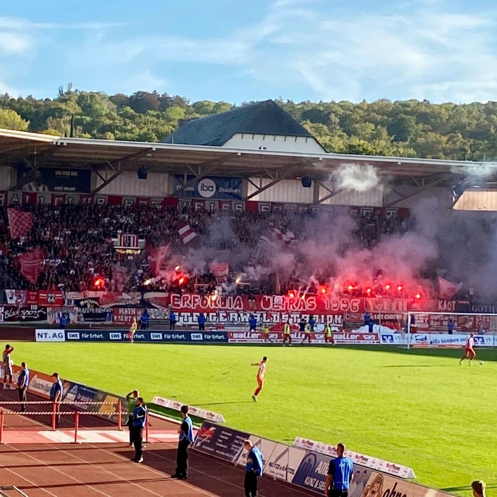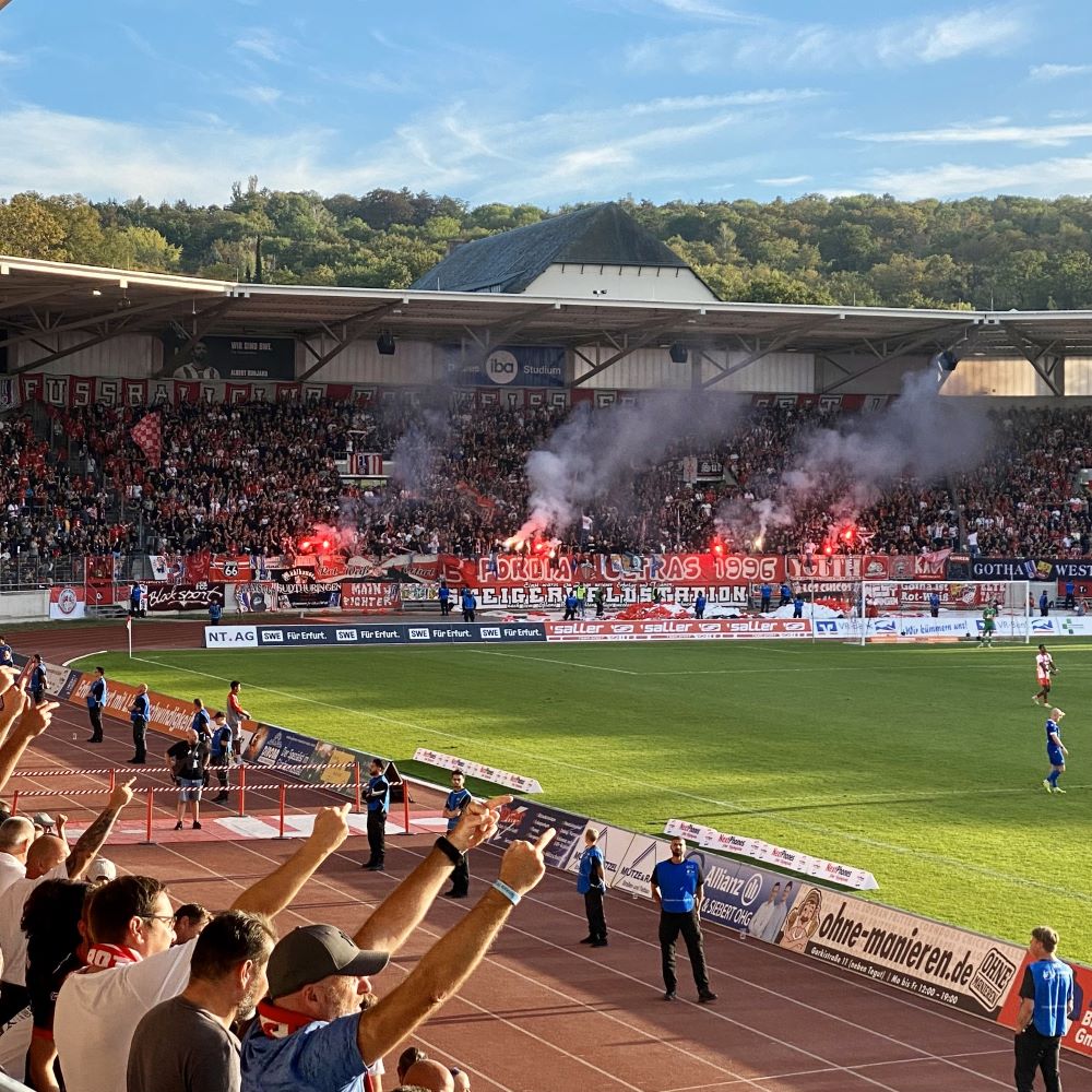 Am 1.Oktober lockte mich das Derby zwischen Rot-Weiß Erfurt und Carl Zeiss Jena nach Thüringen. Dank Deutschlandticket sollte es ein preiswerter Trip werden, der im Anschluss an’s Sonntagsfrühstück um 10:34 Uhr seinen Anfang nahm. Nach Umstiegen in Nordstemmen und Göttingen erreichte ich um 13:46 Uhr die Landeshauptstadt Thüringens. Da der Anstoß des Thüringenderbys um 16 Uhr erfolgen sollte, war allerdings kein großartiges touristisches Programm drin. Ich konnte nur ein bisschen durch die stets sehenswerte Erfurter Altstadt flanieren und gedachte außerdem dort ein Mittagessen zu schmausen. Wer meine gewohnten Ausführungen zu den Sehenswürdigkeiten und der Stadtgeschichte tatsächlich vermisst, darf sich gerne den Bericht Erfurt 12/2022 (noch)mal zu Gemüte führen.