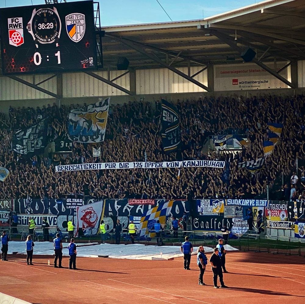 *Am 26.September 2023 wurden von der Polizei zwölf Wohnungen in Jena, Erfurt, Weimar, Arnstadt, Eisenach und Naumburg durchsucht und dabei digitale Speichermedien und andere potentielle Beweismittel sichergestellt. Grundlage sind laufende Verfahren wegen Landfriedensbruch, nachdem es am Vorabend des letzten Thüringenderbys (3. März 2023) in Bad Berka zu körperlichen Auseinandersetzungen zwischen den verfeindeten Fangruppen gekommen war.