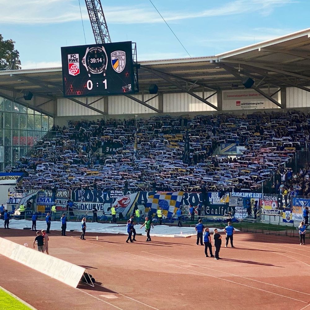 Aber genug der Pedanterie, denn ansonsten ließ das heutige Derby auch bei mir wenige Wünsche offen. Durch die notwendigen Pufferblöcke konnte RWE heute mit 14.750 zahlenden Zuschauern ein prinzipiell ausverkauftes Haus vermelden. Dazu die tollen Kurvenshows zu Spielbeginn und fortan 90 Minuten lang ansprechender Tifo der beiden Fanszenen. Selbst die 22 Kicker auf dem Rasen leisteten einen guten Beitrag zum Gesamterlebnis. Zwar wie zu erwarten keine hohe Fußballkunst, aber die Leidenschaft stimmte und es blieb spannend bis zum Schluss.
