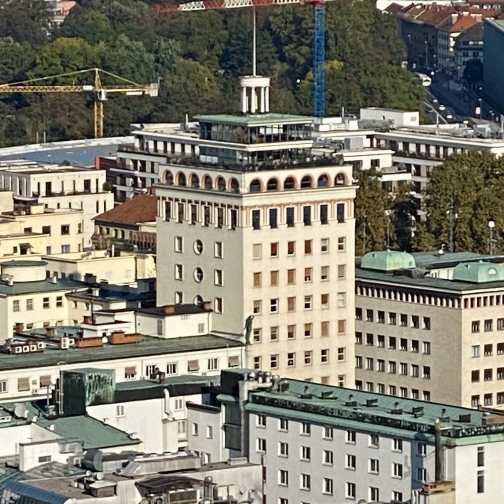 Ich beschloss nun den Lift ins Panoramarestaurant des knapp über 70 m hohen Nebotičnik zu nehmen und dort entspannt einen Cappuccino (3,50 €) zu genießen. Von der Dachterrasse des 1933 fertiggestellten Hochhauses – seinerzeit übrigens das höchste Gebäude Südosteuropas – hat man selbstredend einen fantastischen Ausblick auf Ljubljana (siehe Titelbild). Zugleich konnte ich den knapp verpassten Corteo des Gästemobs noch aus luftiger Höhe verfolgen. Die hatten, von viel Polizei flankiert, mittlerweile ungefähr den ersten der insgesamt 4,5 Kilometer vom Stadtzentrum zum Stadion geschafft.