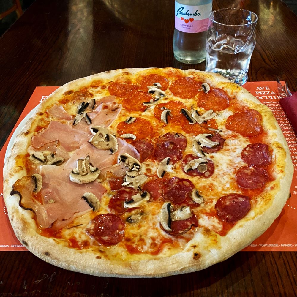 Gegen 11 Uhr schloss ich wiederum meinen Besuch der Ljubljanski grad ab und beehrte wie angekündigt als nächstes die Kathedrale. Nach Entrichtung einer Eintrittsgebühr in Höhe von 2 € durfte ich das wunderschöne barocke Interieur im Augenschein nehmen, welches italienische Künstler im frühen 18.Jahrhundert geschaffen hatten. Danach suchte ich die Pizzerija Foculus zwecks Mittagessen auf. Die hatte mir mein Kumpel Jojo drei Tage zuvor auf der gemeinsamen Anreise nach Schweinfurt empfohlen und Pizza bot sich zugleich prima an, um mich kulinarisch auf die anschließende Weiterreise nach Italien einzustimmen. Zunächst wurde der Durst mit einem halben Liter Mineralwasser gelöscht (2,20 €) und dann orderte ich mir eine große Pizza Napoleon mit Kochschinken, Wildsalami, Kulen und Champignons (13,90 €). Ein sehr delikater Abschluss meines zweiten und sicherlich nicht letzten Kurztrips nach Ljubljana.