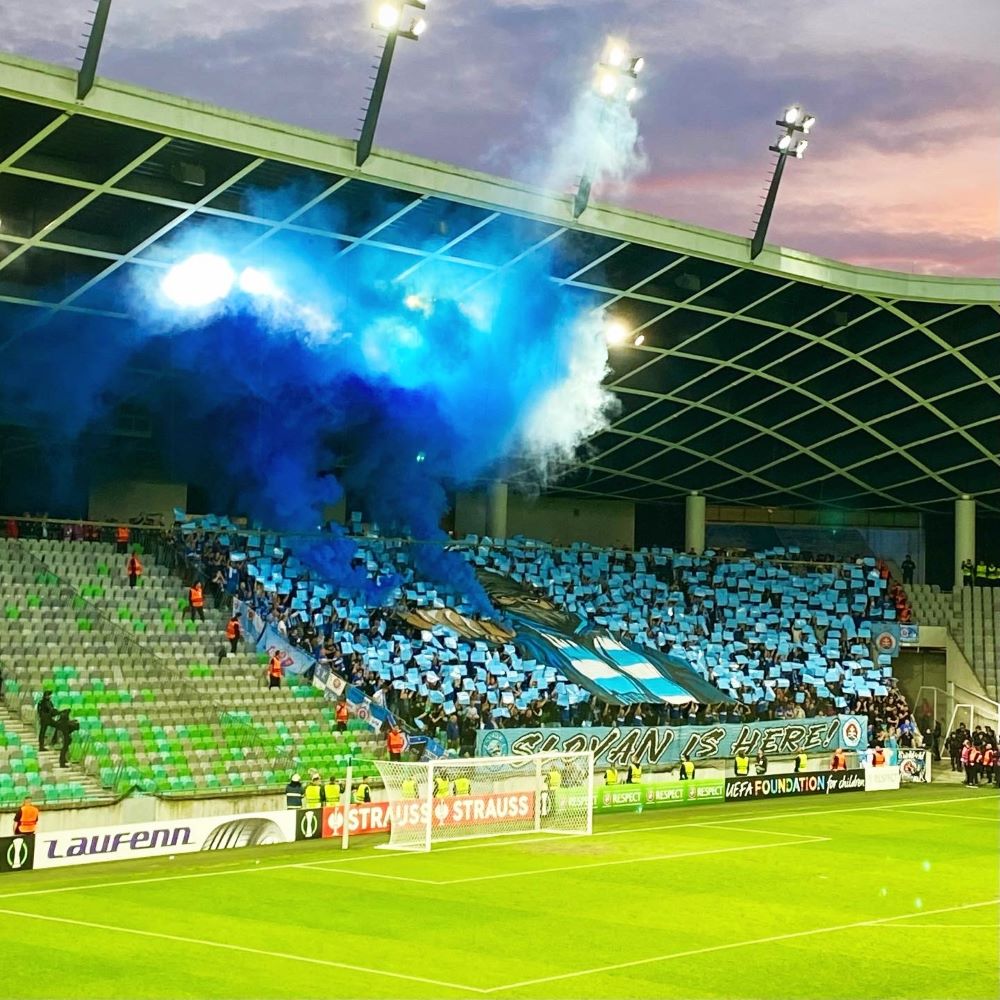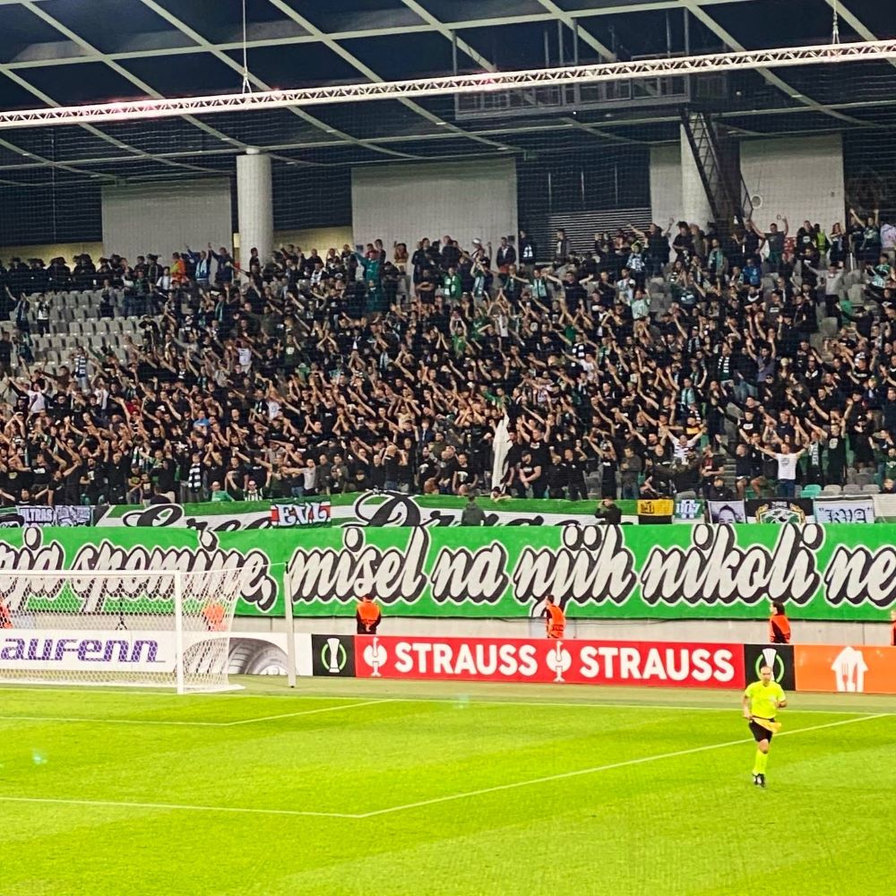 Der Trostpreis für die beiden gescheiterten Landesmeister hieß nun UEFA Europa Conference League. In dieser „Champions League des kleines Mannes“ trafen Olimpija und Slovan in der Gruppenphase außerdem auf Lille OSC und KÍ Klaksvík. Der ŠK Slovan gewann dabei sein Auftaktmatch gegen den färöischen Meister, während NK Olimpija in Lille eine Niederlage erlitt. Nun also das slowenisch-slowakische Meisterduell, welches zumindest seitens der Slowaken großen Anklang gefunden hatte. Die 1.500 Gästekarten gingen allesamt über den Verkaufstresen und die Angst vor weiteren slowakischen Schlachtenbummlern und einer Durchmischung der Fanlager im Stadion war offenbar groß. Entsprechend benötigte ich für einen Platz auf der Gegengerade (30 €) im Onlinevorverkauf einen slowenischen Proxy.