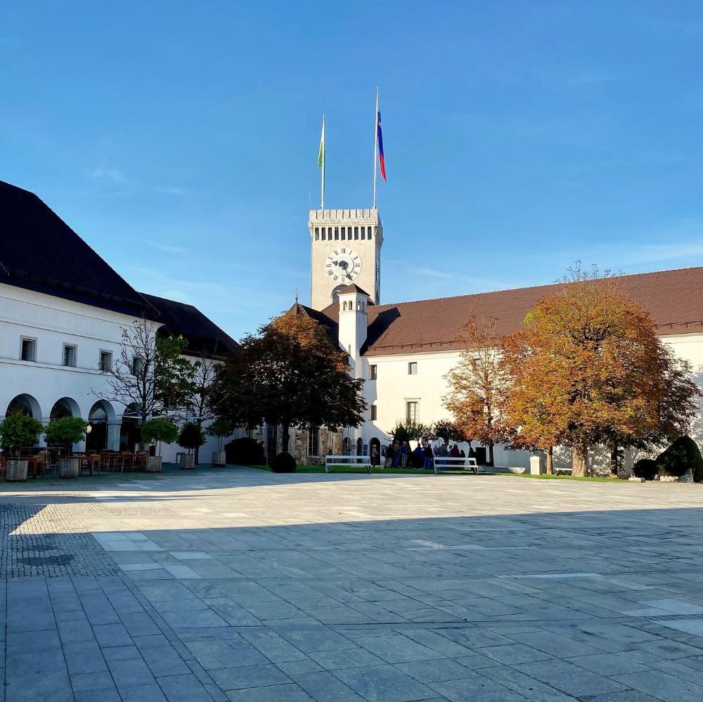 Auch am nächsten Morgen dachte ich als erstes gleich wieder ans Essen. Da ich kein Frühstück zur Übernachtung dazu gebucht hatte, organisierte ich mir für 3 € Burek bei einem Bäcker. Mit diesem südosteuropäischen Streetfood auf der Faust machte ich zwischen 8 und 9 Uhr zunächst einen neuerlichen Stadtspaziergang mit allen wesentlichen architektonischen Sehenswürdigkeiten. Denn als wäre ich der Reiseleiter einer imaginären Tourigruppe, hatte ich den heutigen Vormittag komplett durchgeplant. Nach dem ersten Flanieren sollte es um 9 Uhr hinauf zur Ljubljanski grad (Laibacher Burg) gehen. Um 11 Uhr wollte ich anschließend pünktlich zur Öffnung der örtlichen Kathedrale an die Kirchenpfote klopfen und 11:30 Uhr bis 12:30 Uhr war für Mittagessen und einen weiteren kleinen Spaziergang vorgesehen, ehe 12:55 Uhr schließlich unumstößlich die Weiterreise nach Italien im Tagesplan stand.