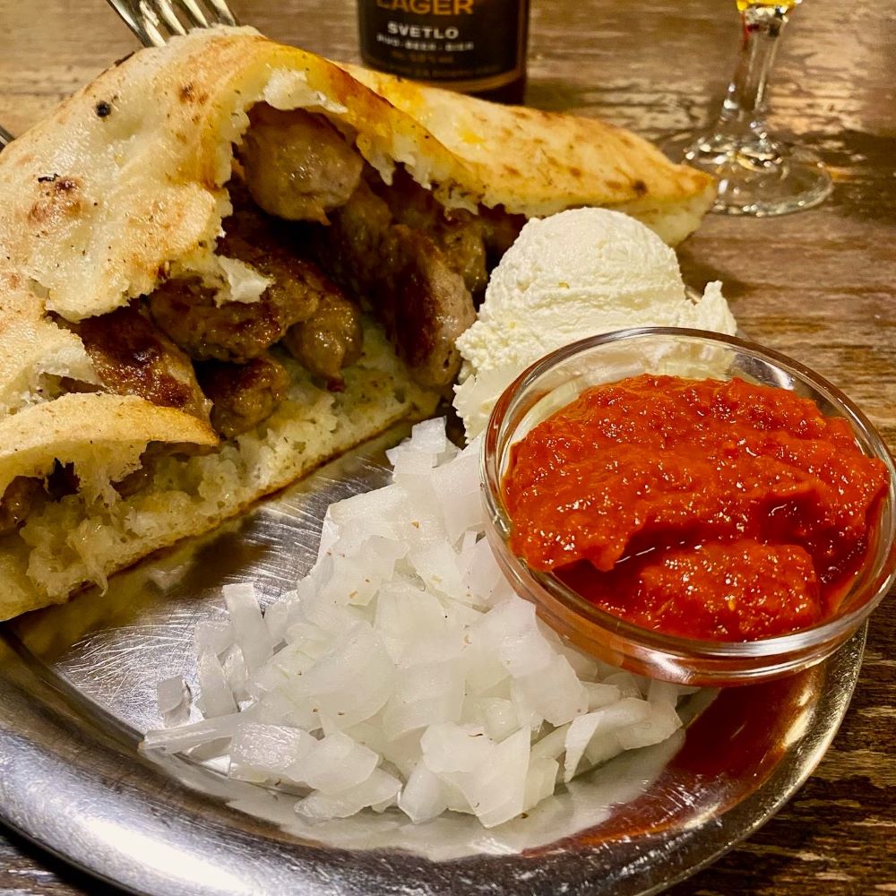 Weil ich durch meinen Fußmarsch zum Stadion heute bereits ausreichend Kalorien verbrannt hatte, nahm ich nach Spielende einen der kostenlosen Shuttlebusse ins Stadtzentrum. Der Bus endete beim Nebotičnik und um 21:15 Uhr war der Abend beinahe noch jung. Hm, schaue ich jetzt als guter Investigativjournalist wirklich beim Escape und Hard Core vorbei und werde vielleicht Zeuge von slowakischen Familienzusammenführungen? Aber wir müssen uns abermals linguistischen Feinheiten widmen. Denn gegenwärtig größer als meine Fleischeslust war meine Fleischlust. Die durfte wie beim Erstbesuch in Ljubljana das dem Nebotičnik nahe gelegene Grillrestaurant Sarajevo ’84 befriedigen. 10 Čevapčiči mit Zwiebeln im Fladenbrot kosteten hier zusammen mit Kajmak und Ajvar 11,40 €, während 0,5 l des hauseigenen Pivo mit 3,30 € zu Buche zu schlugen.