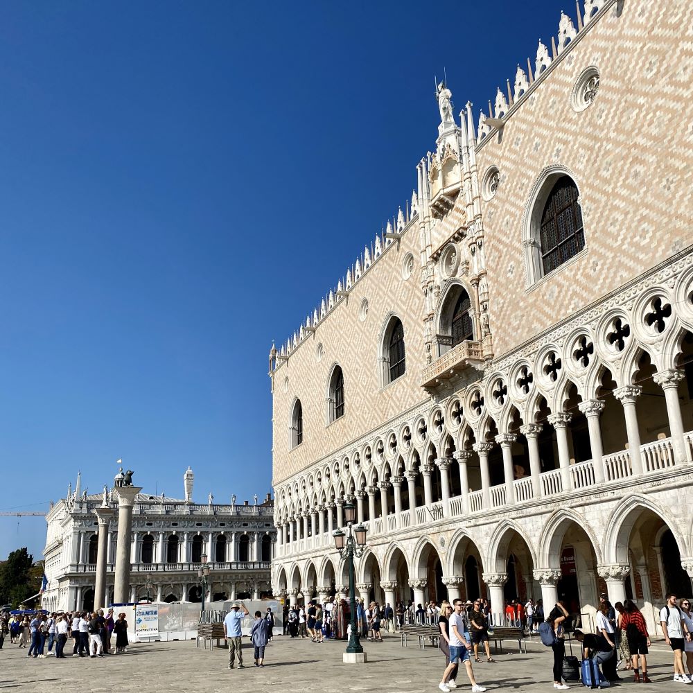 Aber der Palazzo Ducale ist natürlich nicht Zeugnis des Niedergangs der Serenissima, sondern symbolisiert zuvorderst den Höhepunkt des venezianischen Reichtums und Machtanspruchs. Die hier bis 1797 residierenden Dogen hatten zunächst eine lokale Stellvertreterrolle der byzantinischen Herrscher. Doch mit der Loslösung vom Byzantinischen Reich stieg der Doge im späten 8.Jahrhundert gewissermaßen zum Staatsoberhaupt auf. Während die ersten Dogen ihre Amtsgeschäfte in einer hölzernen Zitadelle ausübten, entstand im 9.Jahrhundert der erste Vorgängerbau des heutigen Palazzo Ducale. Im 12. Jahrhundert wurde schließlich ein dreiflügeliger Palast mit Innenhof errichtet, der Mitte des 14. Jahrhunderts nochmal großzügig um- und ausgebaut wurde. Seinerzeit entstand der bis heute im Wesentlichen erhaltene Prunkbau, der zu den bedeutendsten Profanbauwerken der Gotik gezählt wird.