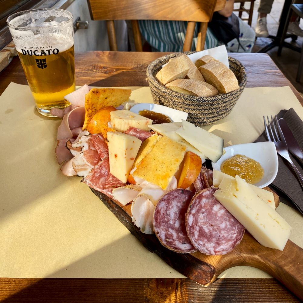 Ich ließ mich nach ein paar Straßenmetern bei der Osteria Salvmeria nieder. Dieses kleine Lokal durfte mir eine üppige Platte mit Käse-, Wurst- und Schinkenspezialitäten servieren (30 €), die mutmaßlich für mehrere Personen gedacht war (aber mein Magen hatte genug Platz). Dazu genoss ich gut gehopfte 0,4 l Via Emilia aus dem Hause Birrificio del Ducato (7 €). Angeblich das international am meisten prämierte Pilsener aus Italien. Aber interessanter fand ich, dass es im Umland von Parma gebraut wird und dieses Bier somit nicht nur – wie auf der Homepage angepriesen – gut zu Salumi e Affettati, sondern auch perfekt zur heutigen Ansetzung Venezia FC vs. Parma Calcio passte.