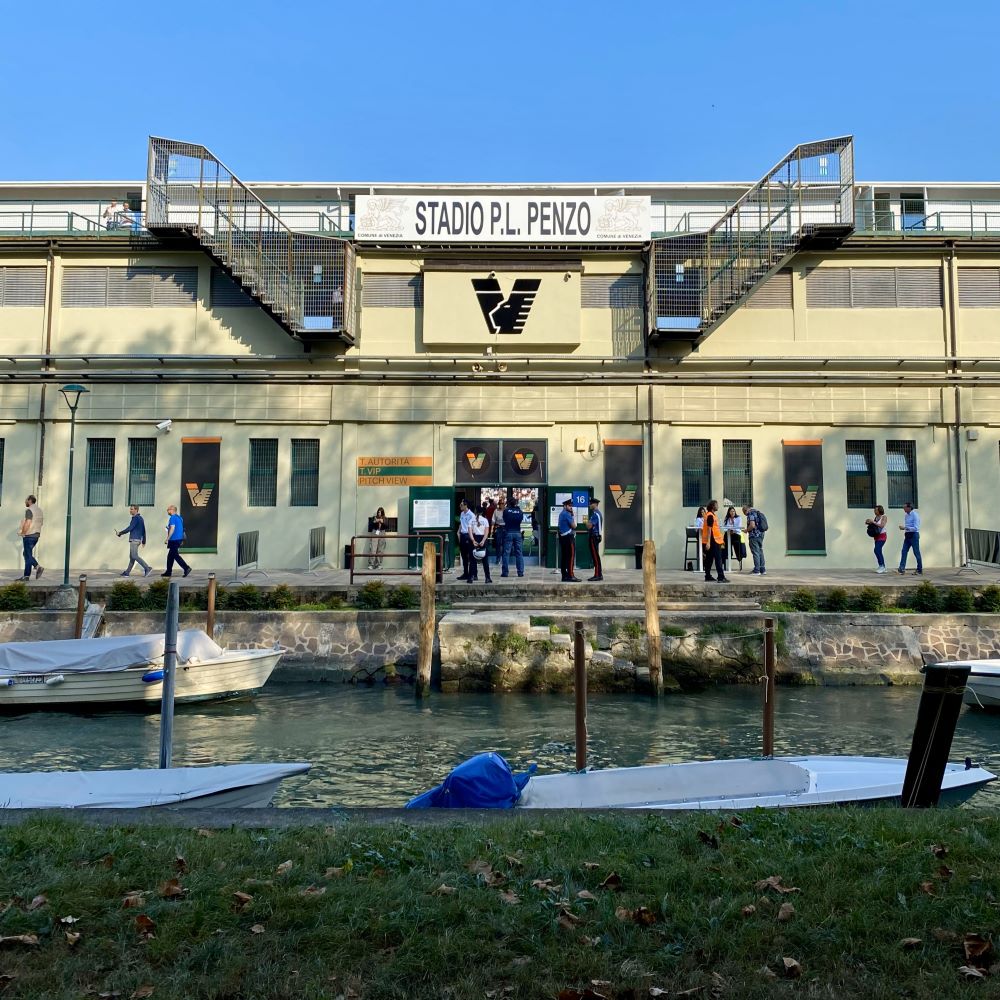 Die letzten 1,312 km zum Austragungsort besagter Ansetzung nahm ich gegen 15:30 Uhr in Angriff. Das Stadio Pier Luigi Penzo des Venezia FC befindet sich im äußersten Osten der Altstadt auf der Insel Sant’Elena und wurde bereits 1913 als Campo di Sant’Elena eingeweiht. Das macht es nach dem zwei Jahre früher eröffneten Stadio Luigi Ferraris in Genoa (Genua) zum zweitältesten Stadion im italienischen Profifußball. Dazu dürfte vielleicht einzigartig sein, dass man die Heimspielstätte des Venezia FC nicht per PKW ansteuern kann. Entweder kommt man per Boot oder wie ich zu Fuß. Da fragt man sich doch gleich, ob es an einem Pier gebaut wurde, der nach einem Ehrenmann namens Luigi Penzo benannt wurde. Aber nein; Pier ist in diesem Fall schon ein Vorname und Pier Luigi Penzo (* 1896) war seines Zeichens italienischer Jagdflieger im Ersten Weltkrieg. Nach Penzos Tod († 1928) befanden die Faschisten, dass man doch posthum das Fußballstadion seiner Heimatstadt nach ihm benennen könnte.