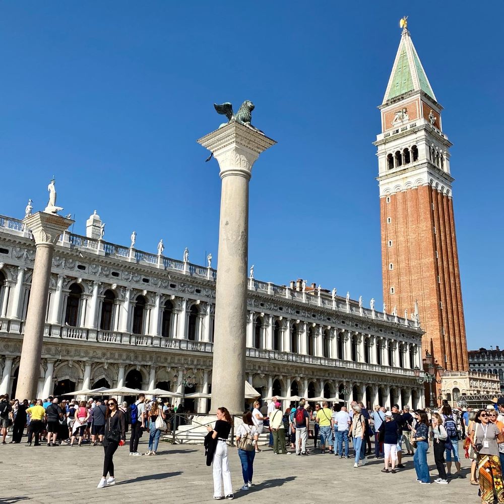 Auf der anderen Seite der Ponte di Rialto steuerte ich im Sestiere San Marco dann zielstrebig die Piazza San Marco (Markusplatz) an. Diese Piazza ist mit einer Breite von 82 m und einer Länge von 175 m nicht nur Venezias größter, sondern wahrscheinlich auch der einer berühmtesten Plätze der Welt. Hier findet der Besucher die Basilica di San Marco (Markusdom) nebst 98,6 m hohen Campanile (Glockenturm), wie auch die einen Großteil des Platzes umschließenden Procuratie di San Marco (Prokuratien), in denen u. a. das Museo Correr und das Museo Archeologico Nazionale di Venezia zuhause sind. Am Nebenplatz Piazzetta San Marco befinden sich ferner die beiden den Stadtheiligen Marco (Markus) und Todaro (Theodorus) gewidmeten Säulen, sowie die Biblioteca Nazionale Marciana und der Palazzo Ducale (Dogenpalast).
