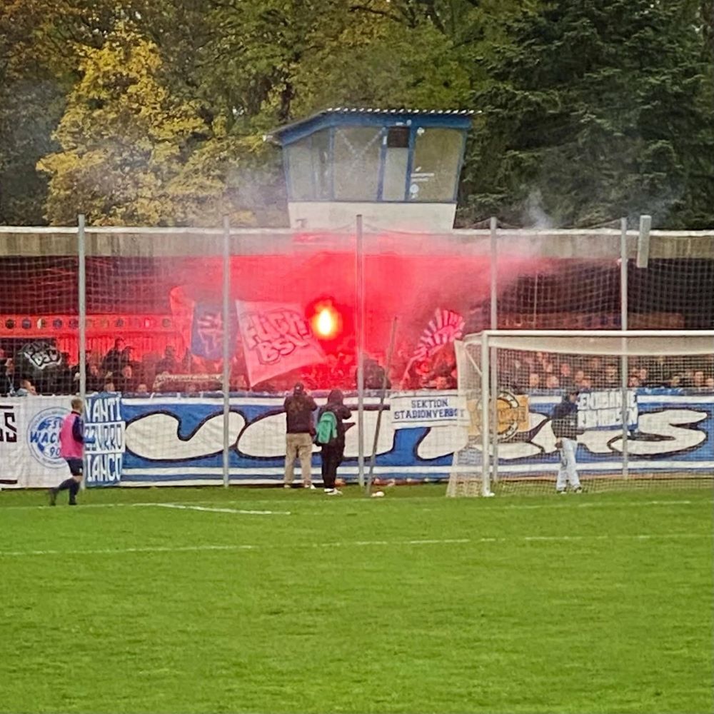 Nach dem Seitenwechsel wurde die 2.Halbzeit mit einer sehenswerten Aktion der Ultras Nordhausen unter dem Motto „Scheiss SDH“ eingeläutet (siehe Titelbild) und wenig später sorgte u. a. das Abbrennen von Eintracht-Fanartikeln in der Heimkurve für eine weiterhin hitzige Atmosphäre. Ich bin sicher, insgeheim malte sich der ein oder andere Wacker-Fan aus, dass der abgeschlagene Tabellenletzte (erst 5 Punkte in 9 Spielen) noch standesgemäß abgeschossen und somit auch sportlich gedemütigt wird. Aber den Gefallen tat die Mannschaft aus der Kalistadt dem Rivalen nicht. Torgefahr ging zwar kaum vom Ballsportverein aus. Doch solange es nur 2:1 stand, lebte im blau-gelben Lager die Hoffnung auf einen schmeichelhaften Punktgewinn weiter.