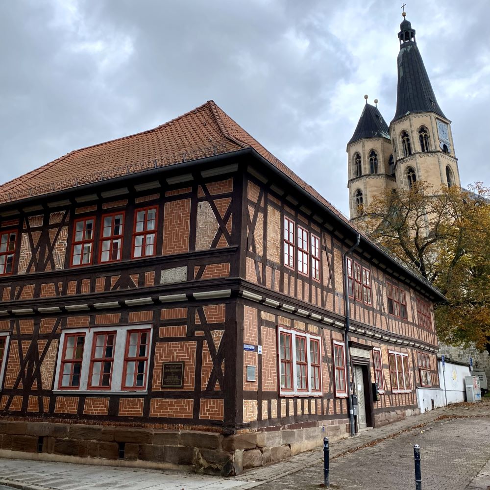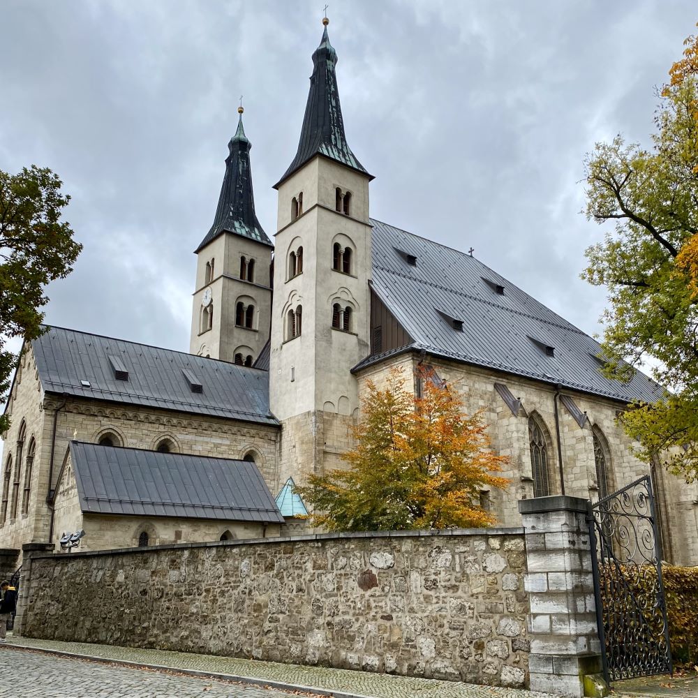 Bei besagten Kirchen stellte der Dom zum Heiligen Kreuz einen Pflichtbesuch für mich dar. Diese Kirche hat ihren Ursprung in der Errichtung eines Damenstiftes durch die ostfränkische Königswitwe Mathilde im Jahre 961. Vom ersten Bau ist nichts mehr vorhanden, aber vom romanischen Neubau im 12.Jahrhundert existieren Überreste des Kreuzgangs, die unteren Teile der Türme und die Krypta. Nachdem das Damenstift 1220 in ein Chorherrenstift umgewandelt wurde, erfolgte schließlich ein großer Umbau im Stile der Gotik, der im Wesentlichen bis heute erhalten wurde. Bischofssitz war diese Kirche zwar nie, aber der Name Dom war im Mittelalter auch für bedeutende Kloster- und Stiftskirchen üblich, denen ähnlich wie in einer Diözese noch diverse Pfarrgemeinden unterstanden (Vgl. Quedlinburg 10/2020).