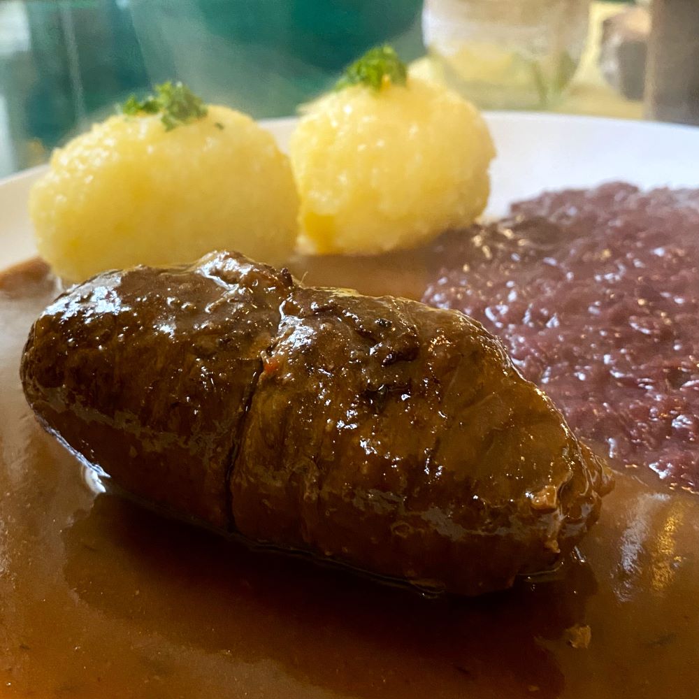 Gegen 12:45 Uhr hatte ich vorerst genug touristische Eindrücke gesammelt und kehrte zum Mittagessen in die Gaststätte Alt Nordhausen ein. Rustikales Ambiente und bodenständige Küche könnte man hier wohl als Schlagwörter in den Raum werfen. Ich entschied mich für ein großes Schwarzbier (4,50 €) und die Rinderroulade (18,90 €), die genau wie die begleitenden Klöße und die Sauce ganz hervorragend war. Lediglich der Apfelrotkohl hatte mir zu viel Zucker abbekommen. Das war für meinen Geschmack einen Tick über der angemessenen Süße.