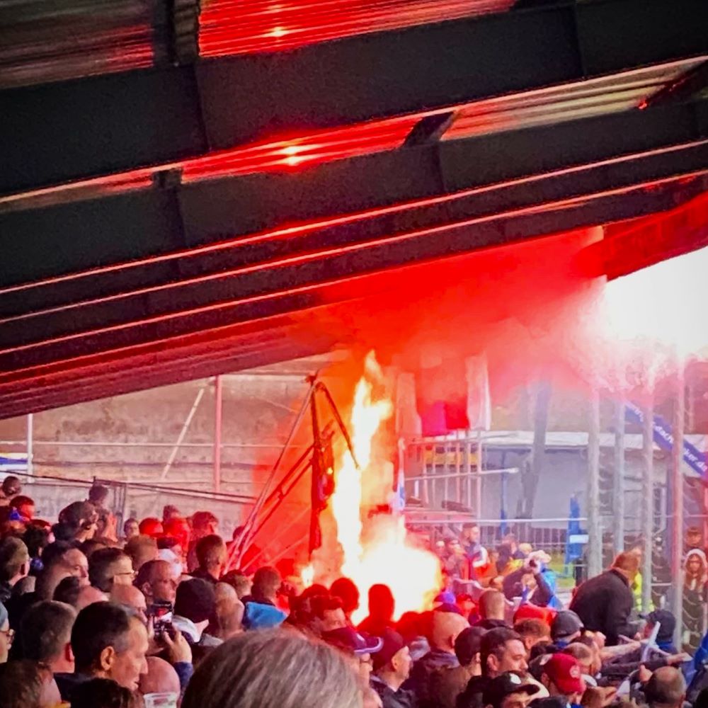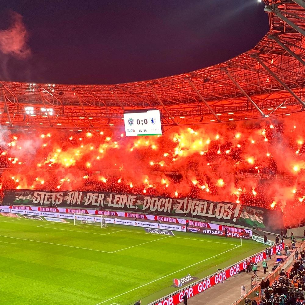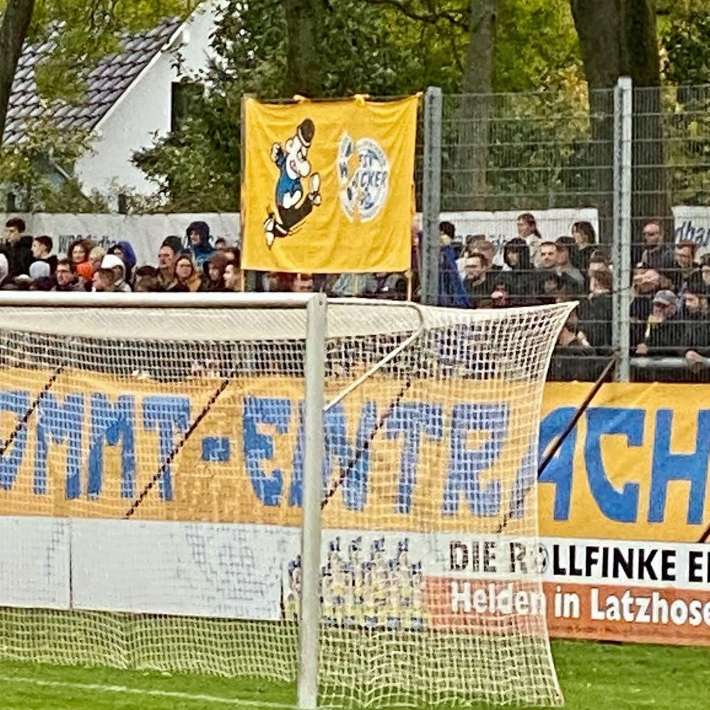 Ebenfalls bereits drin war der in hannoverschen Hoppingkreisen bestens bekannte Halter des Fahrzeugs mit dem amtlichen Kennzeichen HOL-** **. Ich hatte seinen PKW bereits auf dem Stadionparkplatz erspäht und betrat den Sportpark nun mit der Gewissheit, dass für meine Beschallung nicht nur die beiden Fanszenen zuständig sein werden. Ich wurde auf der Gegengerade prompt freundlich begrüßt und wies nun ebenso freundlich darauf hin, dass bei mir gerade erst eine Virusinfektion abgeklungen ist und ich im schlimmsten Fall vielleicht doch noch ansteckend bin. Aber störte mein Gegenüber nicht und wirkliches Risiko von zu vielen infektiösen Aerosolen hätte wahrscheinlich nur bestanden, wenn ich derjenige mit der Polyphrasie gewesen wäre.