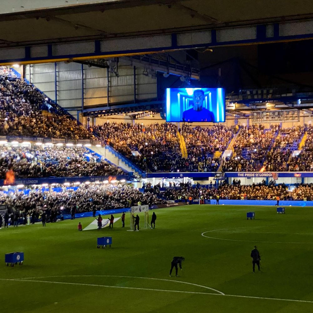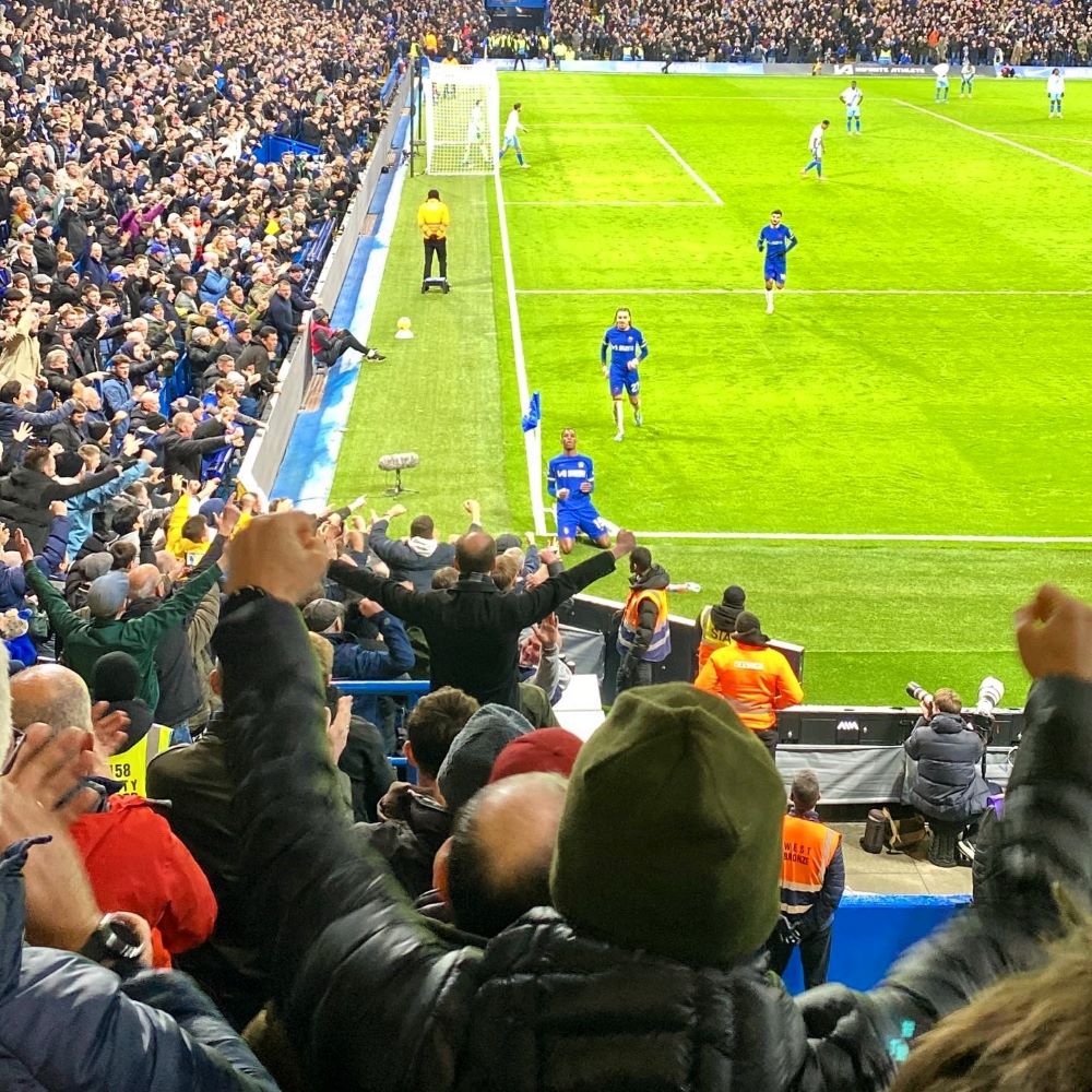 Während Chelsea das Stadtduell mit Crystal Palace gut im Griff haben zu schien, wechselte ich zur 30.Minute den Platz. Ein Sitz am Rand war nach wie vor frei geblieben und aus der Perspektive jenes deutlichen Upgrades sah ich nun auch die ganzen Zaunbanner an den Brüstungen der Ober- und Mittelränge etwas besser. Texas, New York, Philadelphia, Melbourne, Kerala, V.A.E., Malta, Kroatien, Frankreich, Chile… Da sieht man wieder die Globalität der englischen Topclubs, wie auch den Trend den Supporter’s Clubs aus Übersee permanente Bannerplätze im Stadion zu überlassen. Aber ist immerhin exorbitant emissionsärmer, als wenn Steve aus Melbourne und José aus Santiago persönlich zu den Spielen nach London kommen würden.