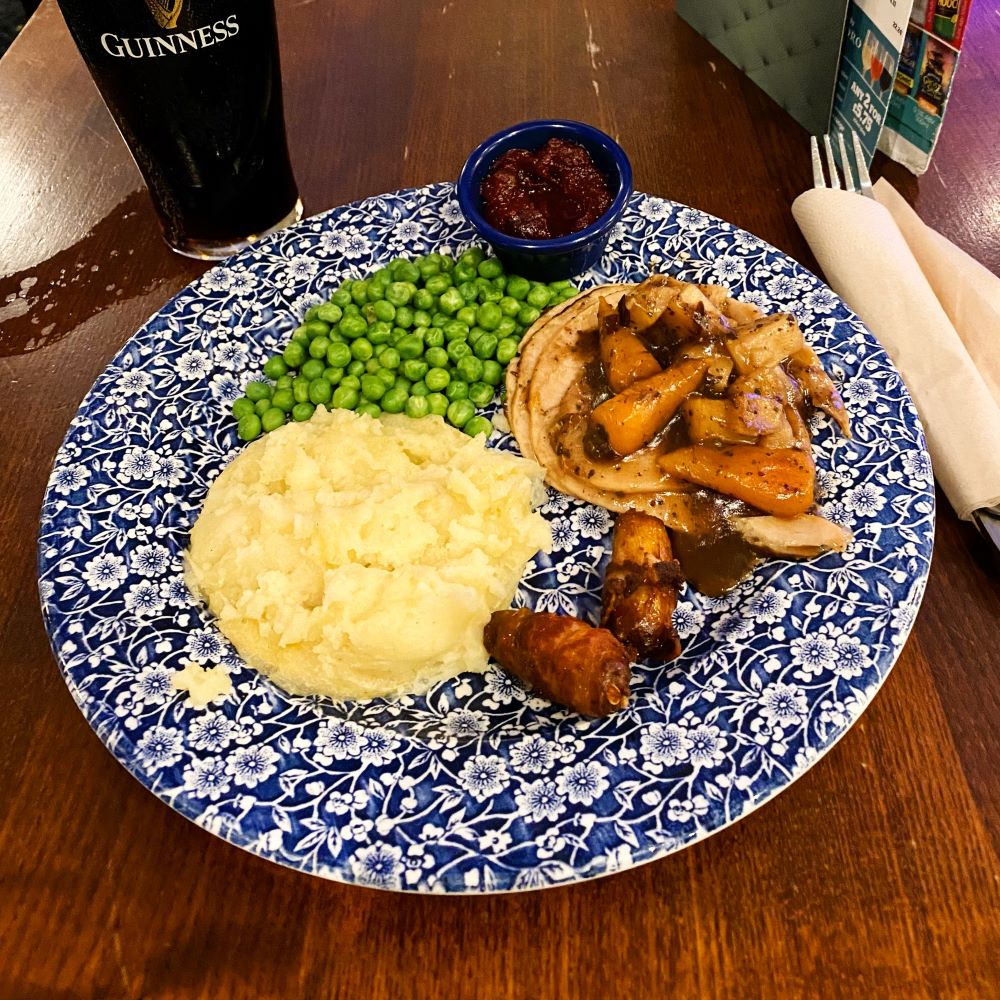 Nach Spielende führte der schnellste Weg nach Sutton über Wimbledon. Dort beschloss ich einen Zwischenstopp im Wetherspoon’s namens The Wibbas Down Inn einzulegen. So’n richtiges Abendessen musste schließlich auch noch her und der Pub offerierte weiterhin sein Weihnachtsspezial. „Four slices of turkey breast served with roasted Chantenay carrots, parsnips, Maris Piper mash, two pigs-in-blankets and peas, served alongside a pork, apricot and cranberry stuffing, cranberry sauce and gravy“ las sich ganz gut und £ 13.49 (15,60 €) inklusive Pint Guinness klang fair dafür. Was wenig später jedoch an meinen Tisch kam, war wirklich eine Frechheit. Die vier Scheiben Fleisch hatten lediglich die Dicke von Aufschnitt und das angepriesene Stuffing fehlte gänzlich. Wie sehr muss man sowohl Weihnachten, als auch seine Kunden hassen, dass man so etwas als Festtagsbraten serviert?