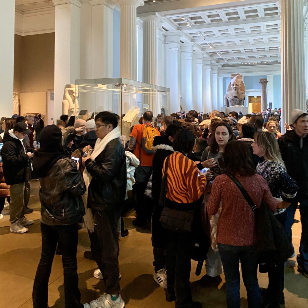 Um kurz nach 10 Uhr verließ ich das Hotel und machte mich wieder auf gen Stadtzentrum. Ich hatte mir ab 11:30 Uhr ein Time Slot im British Museum gebucht und erreichte das vielleicht bedeutendste kulturgeschichtliche Museum der Welt mehr als pünktlich. Leider sorgte das im Voraus gebuchte Ticket nur dafür, dass ich schön an der 200 m langen Warteschlange vorbei durfte. Den Zugang mit Slots allgemein zu begrenzen, beabsichtigt das British Museum jedoch offenbar nicht. Heute schien sogar einer dieser Toptage zu sein, wo über 25.000 Menschen ins Museum strömen (insgesamt über 6 Mio Besucher p. a.).