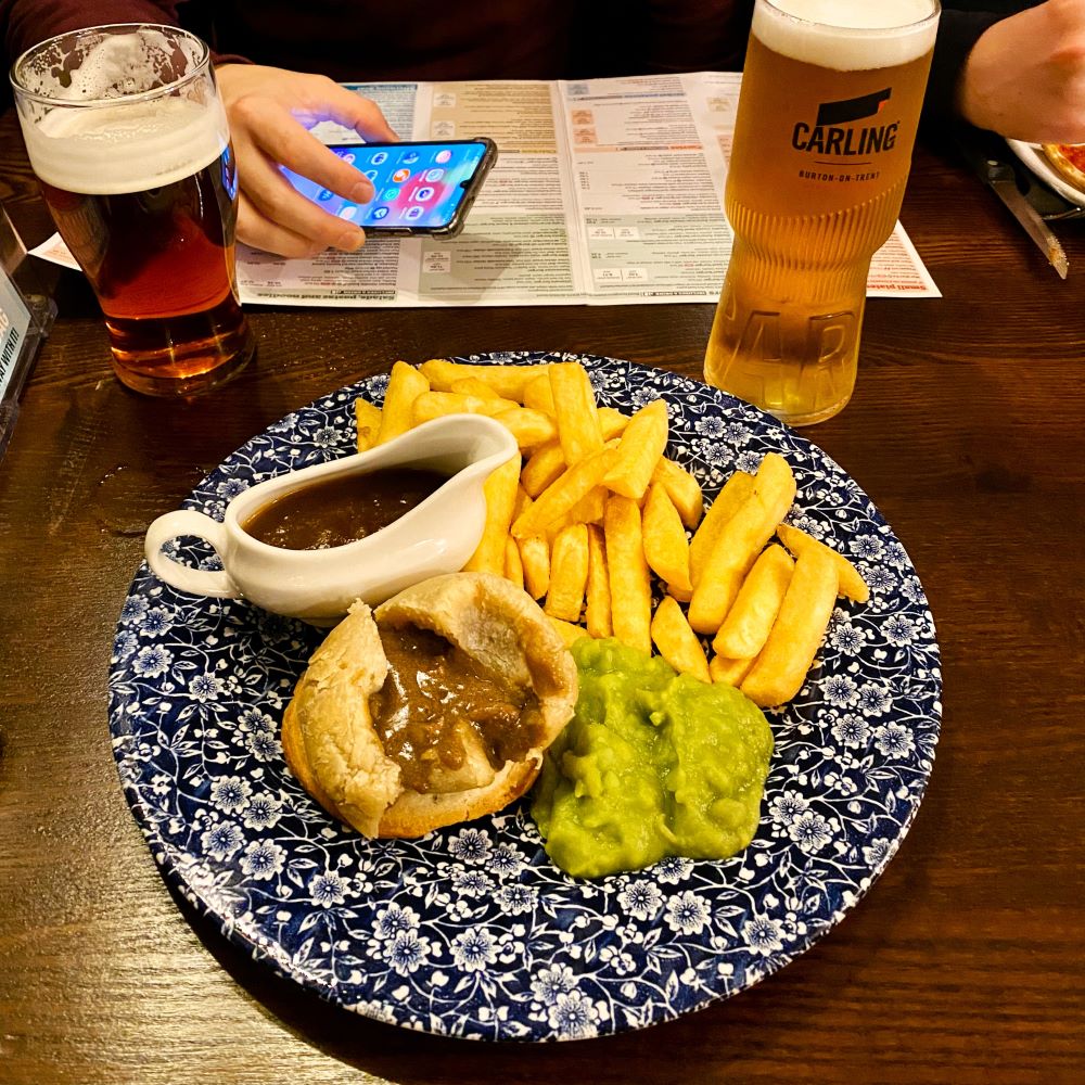 Allerdings teilten wir schnell die gemeinsame Vision einer warmen Mahlzeit im Warmen und damit konnte das The George Inn mangels freien Plätzen im Inneren nicht dienen. So ging es leider doch zeitnah in den nächstbesten Wetherspoon’s namens The Pommelers Rest. Dort war zwar auch viel Betrieb. Aber wie bestellt, war tatsächlich noch ein einziger Tisch frei und der hatte exakt die benötigte Anzahl an Stühlen. In Sachen Abendessen fand nun jeder etwas Passendes und an weiteren Ales und Ciders sollte es ebenfalls nicht mangeln, bis wir kurz vor 19 Uhr zu fünft zum Bahnhof London Bridge aufbrechen mussten (der Ananasmann wollte lieber im Pub weiterzechen*).