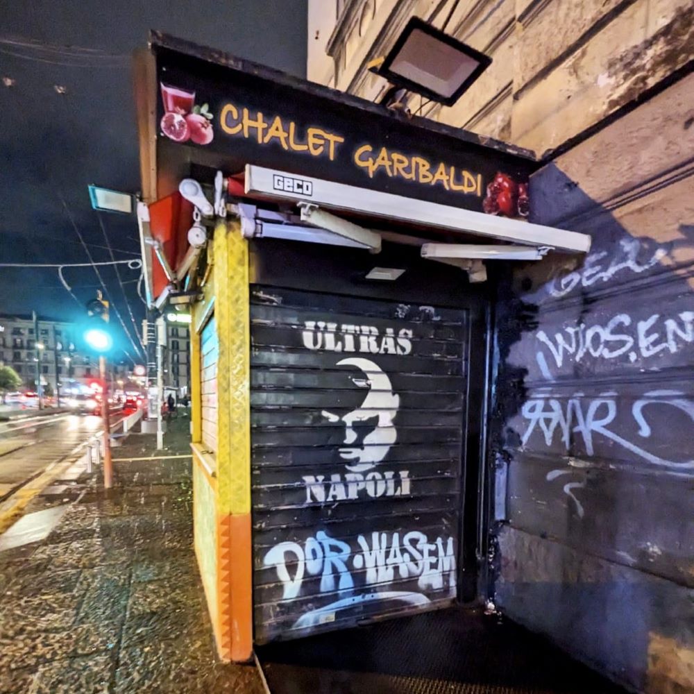 Nach einer kurzen Verschnaufpause, starteten wir um 16 Uhr unseren ersten Spaziergang durch die 912.000-Einwohner-Metropole am Fuße eines Vulkans. Da Glatto vor fünf Jahren schon einmal in Napoli zu Gast war, konnte er dabei Orientierung bieten. Zunächst führte er mich durch die engen Altstadtgassen des Centro Storico, die von der Meisterfeier im vergangenen Jahr immer noch festlich geschmückt waren. Auch Graffiti und Wandbilder mit Bezug zur SSC Napoli sind inflationär vorhanden und insbesondere das Konterfei der Vereinsikone Diego Maradona ist omnipräsent. Der 2020 leider verstorbene einstige argentinische Ausnahmefußballer genießt in Napoli einen ähnlichen Gottstatus wie in seinem Heimatland.