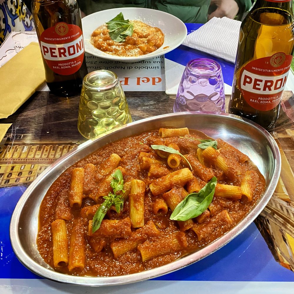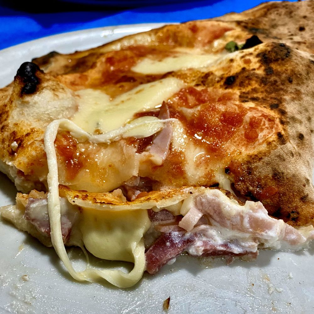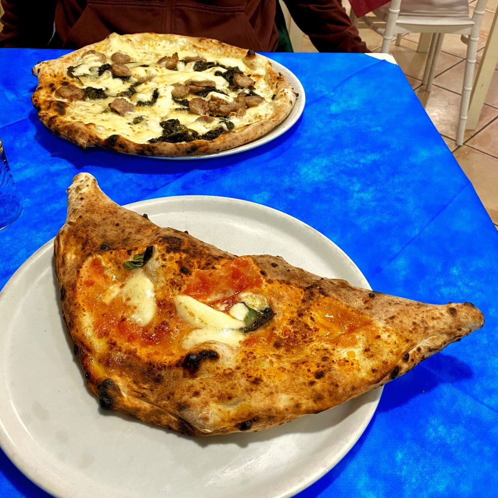 Anschließend ging es zurück in die Altstadt, wo wir gegen 20 Uhr mächtig Appetit auf neapolitanische Pizza verspürten. Rund um’s Teatro Trianon schien es in der Geburtsstadt der Pizza eine besonders große Häufung von holzbefeuerten Steinöfen zu geben und den Zuschlag bekam letztlich die Pizzeria Spuzzuliamm. Wir orderten dort zunächst große Biere und zwei köstliche Varianten von Bruschetta (einmal klassisch und einmal opulent nach Art des Hauses). Danach wurden uns zwei fantastische Pizzas serviert. Glatto hatte die Giuseppe (mit Salsiccia, Friarelli und Provolone) und ich die Ripieno Napoletano (eine gefüllte Pizza mit Provolone, Salame Napoli, Prosciutto cotto und Ricotta). Alles ein Gedicht und bei einer Gesamtrechnung von 32 € auch alles andere als teuer.