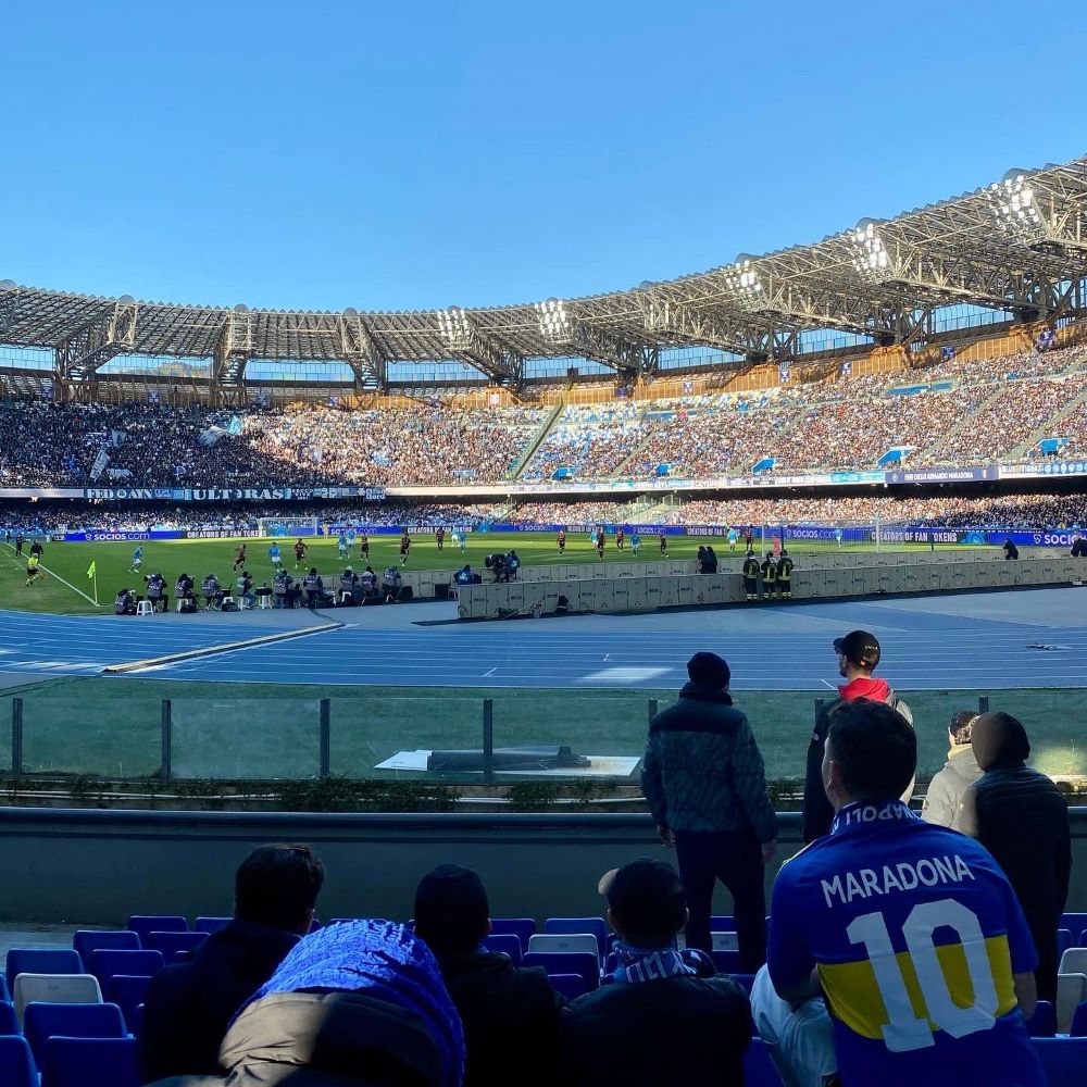 Um 14 Uhr orientierten wir uns schließlich zu einer neuzeitlichen Sehenswürdigkeit der Stadt. Denn im 1959 als Stadio del Sole eröffneten heutigen Stadio Diego Armando Maradona sollte der amtierende italienische Fußballmeister SSC Napoli um 15 Uhr den regionalen Rivalen US Salernitana zum Derby empfangen. Mit der Bahn ging es vom Fuße des Vomero binnen weniger Minuten direkt vor das gegenwärtig 54.726 fassende Stadion, von welchem ich bei der Coppa del Mondo Italia ’90 (Fußballweltmeisterschaft 1990) erstmals Notiz nahm. Bei diesem für die Entwicklung meiner Fußballleidenschaft so prägenden Turnier diente das zwischen 1963 und 2020 als Stadio San Paolo firmierende Rund fünfmal als Spielstätte.